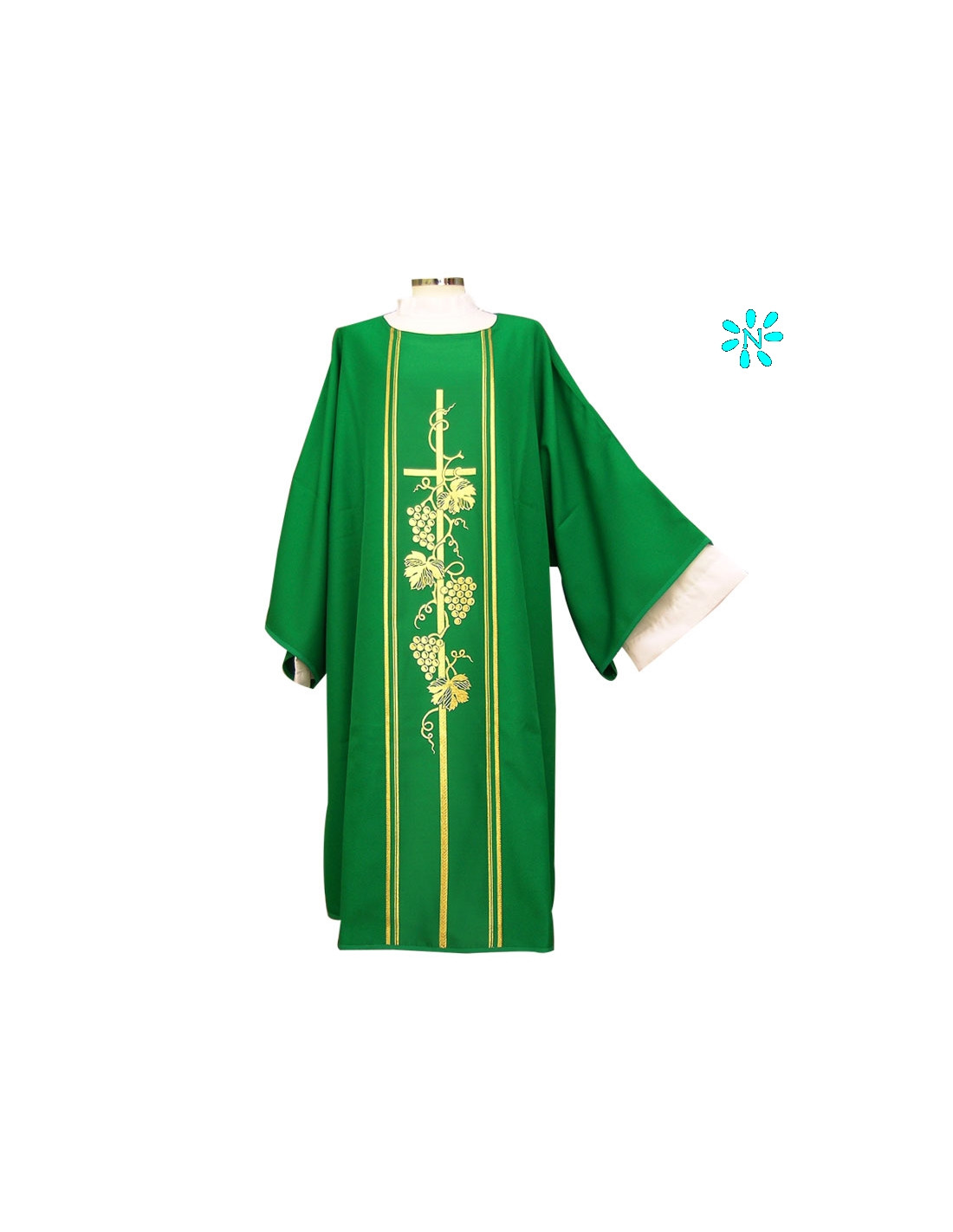 Dalmática verde estampada, confeccionada en tejido liso de alta calidad. Motivo central de Cruz larga con racimos. Cuello redondo. Disponible en más colores litúrgicos. Confeccionada en la UE.