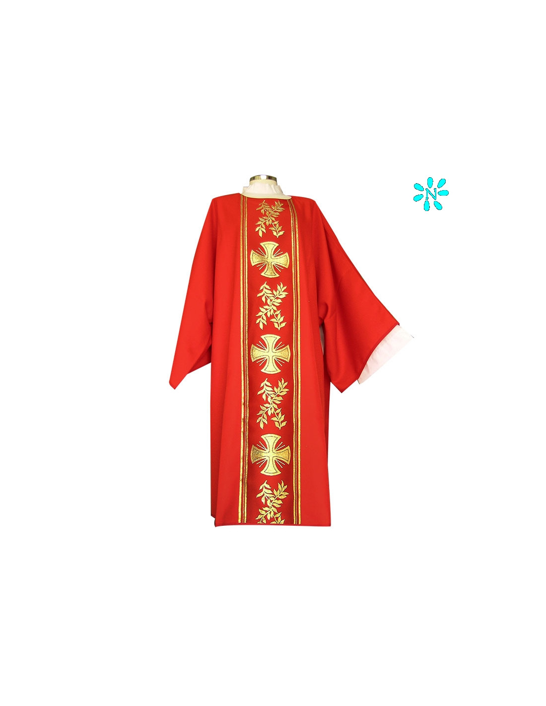 Dalmática roja estampada, confeccionada en tejido liso de alta calidad. Motivo central de cruces con ramas de olivo alternadas. Cuello redondo. Disponible en más colores litúrgicos. Confeccionada en la UE.