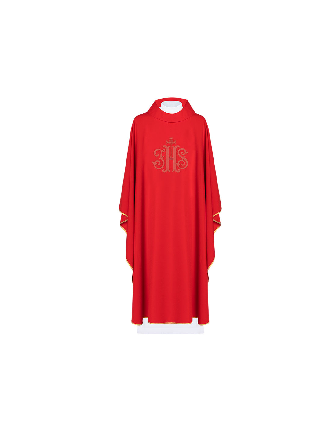 Casulla roja bordada con galón central, confeccionada en tejido Kor/210 de alta calidad, y ribeteada en dorado. Motivo central de JHS con Cruz superior. Cuello cerrado, con estola interior incluida. Últimas unidades. Confeccionada en la UE.
