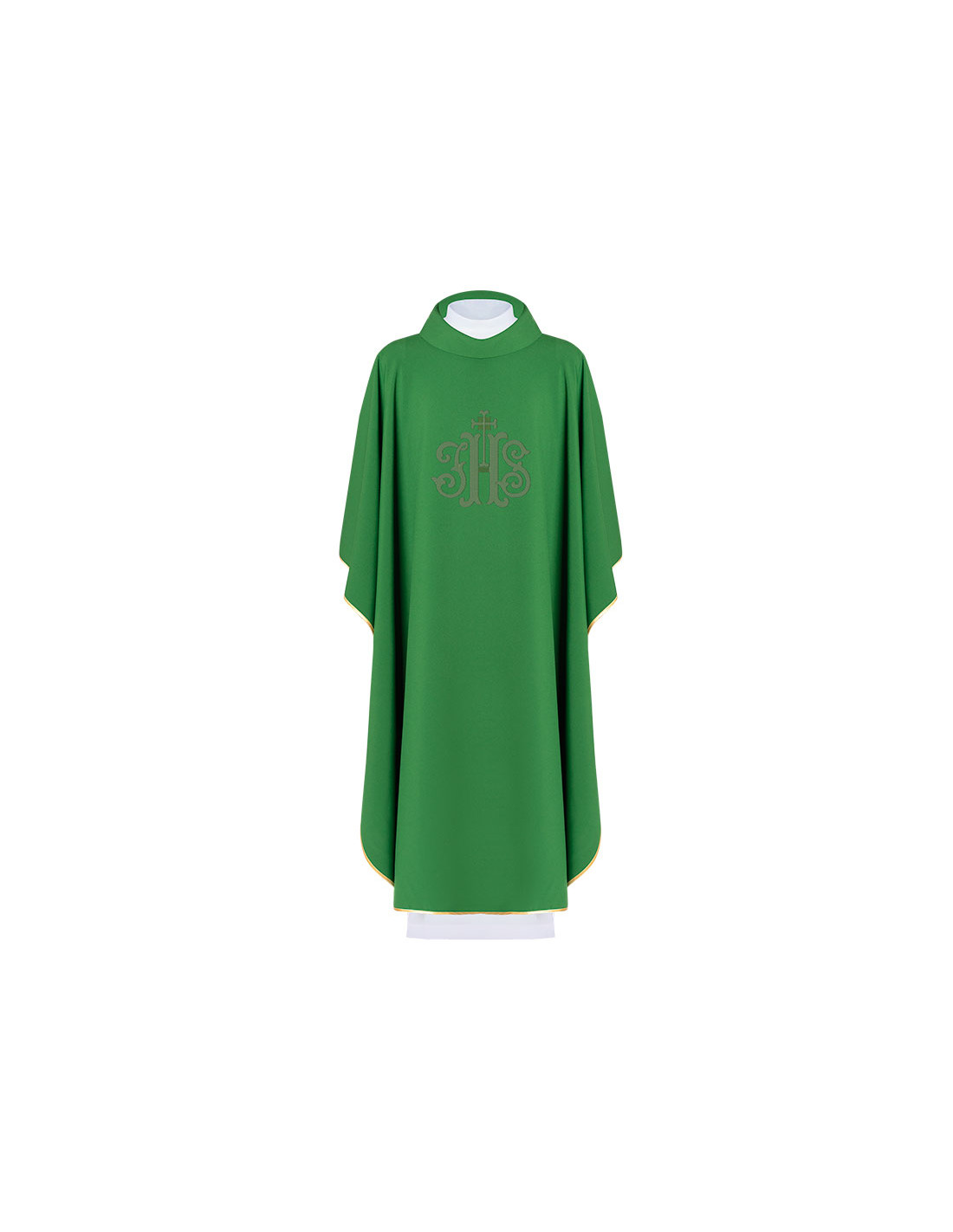 Casulla verde bordada con galón central, confeccionada en tejido Kor/210 de alta calidad, y ribeteada en dorado. Motivo central de JHS con Cruz superior. Cuello cerrado, con estola interior incluida. Últimas unidades. Confeccionada en la UE.