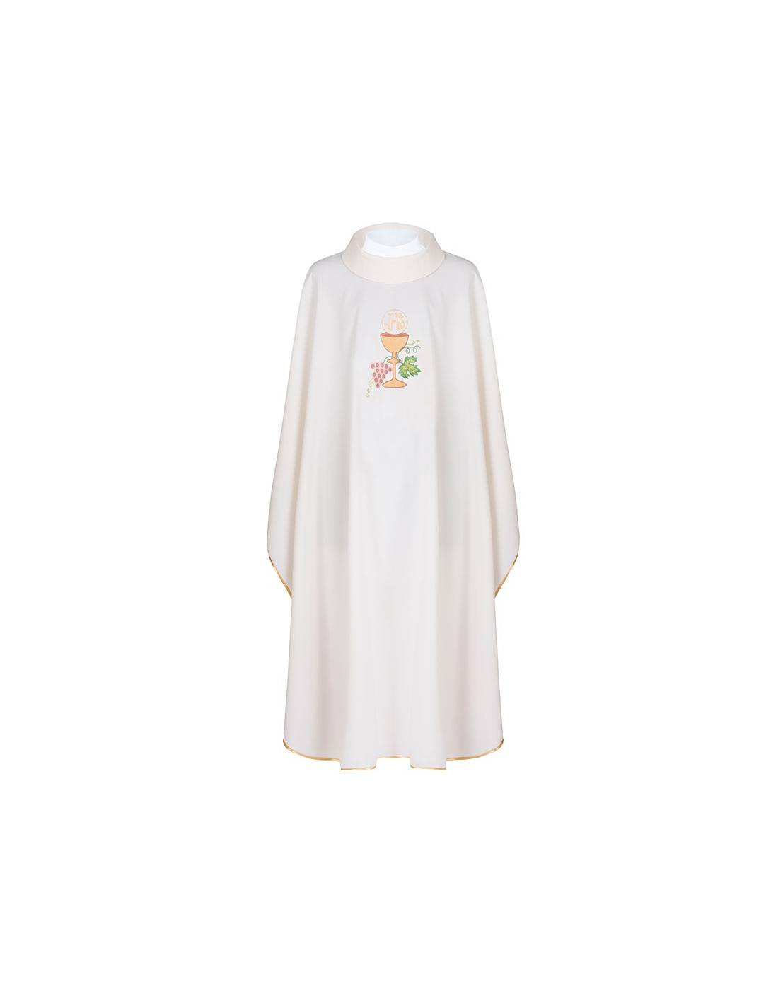 Casulla bordada con galón central, confeccionada en tejido Kor/208 de alta calidad, y ribeteada en dorado. Motivo central de caliz con hojas de parra. Cuello cerrado, con estola interior incluida. Últimas unidades. Confeccionada en la UE.