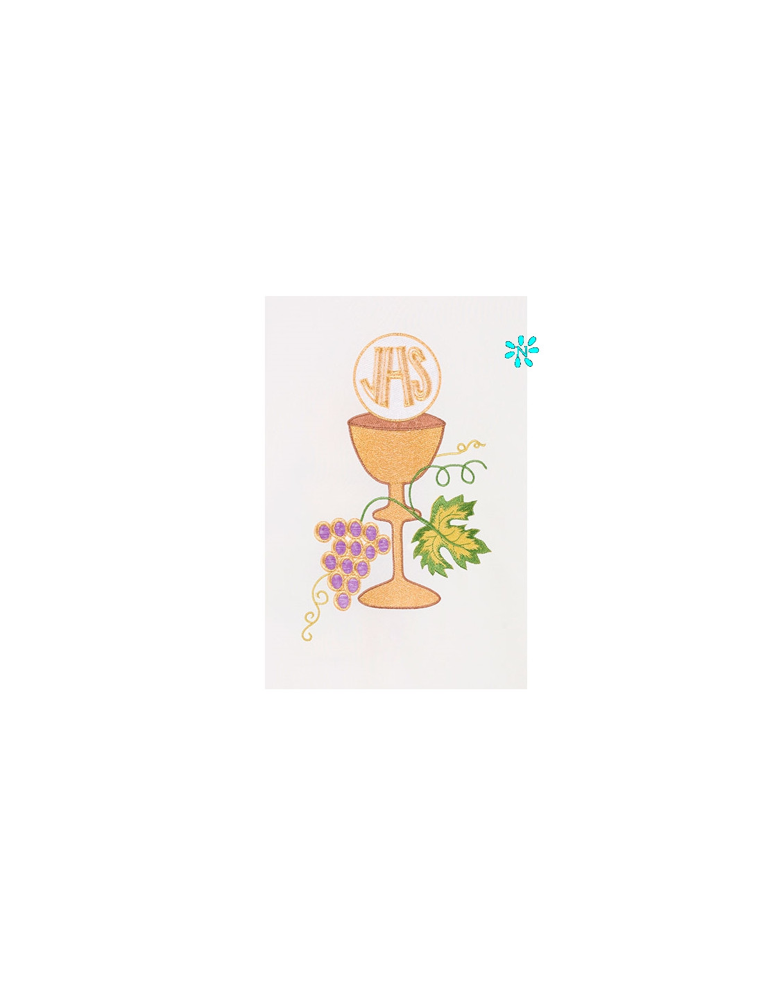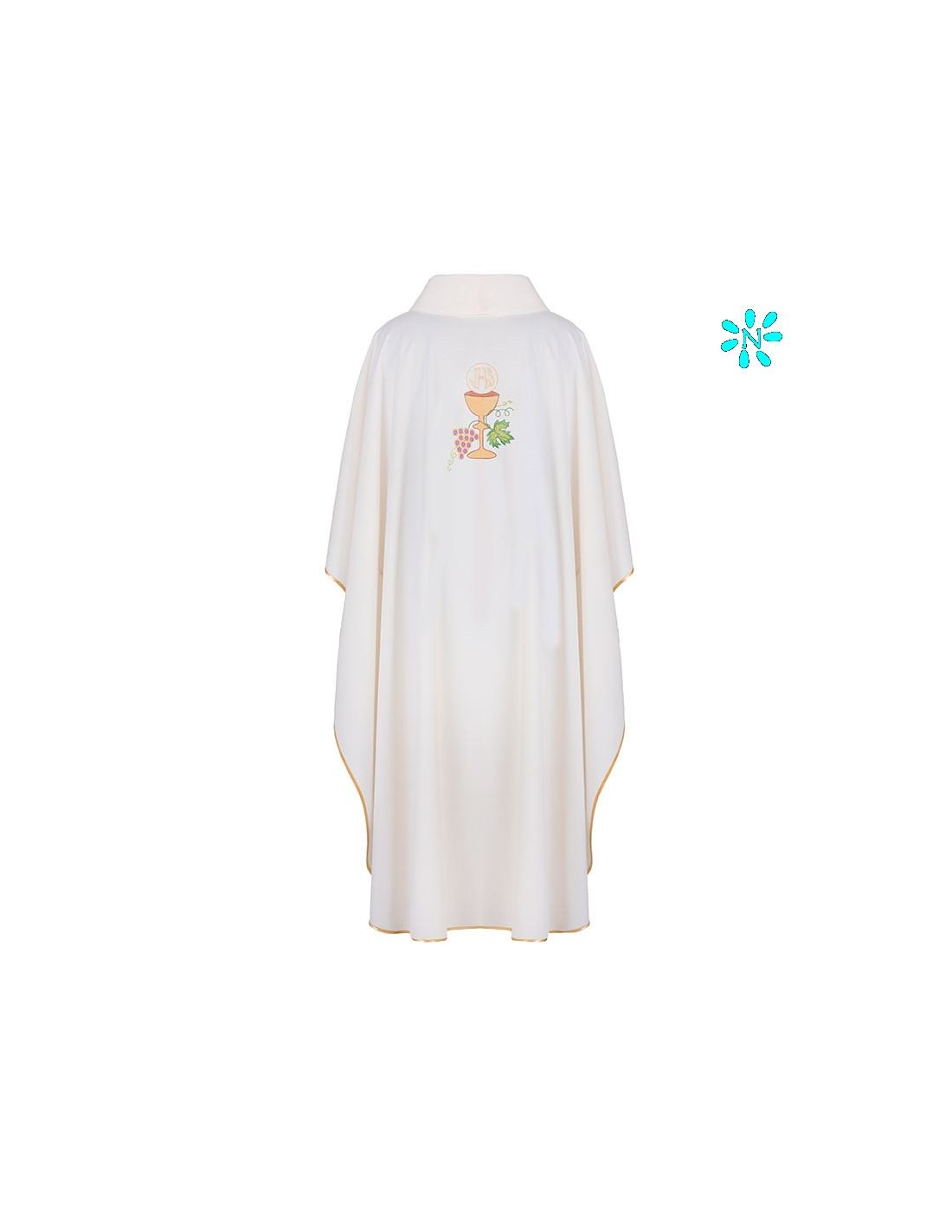 Casulla bordada con galón central, confeccionada en tejido Kor/208 de alta calidad, y ribeteada en dorado. Motivo central de caliz con hojas de parra. Cuello cerrado, con estola interior incluida. Últimas unidades. Confeccionada en la UE.