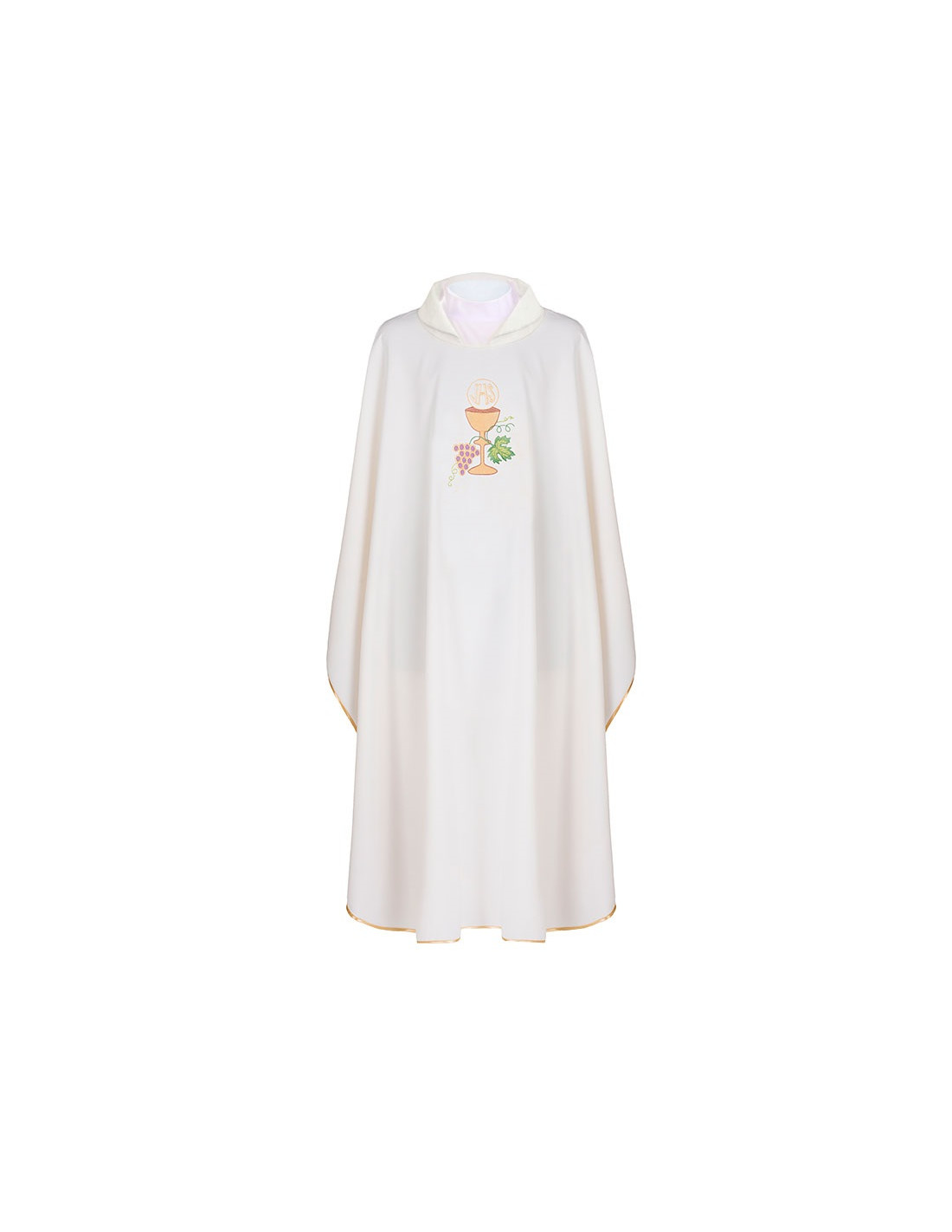 Casulla bordada con galón central, confeccionada en tejido Kor/208 de alta calidad, y ribeteada en dorado. Motivo central de caliz con hojas de parra. Cuello cerrado, con estola interior incluida. Últimas unidades. Confeccionada en la UE.