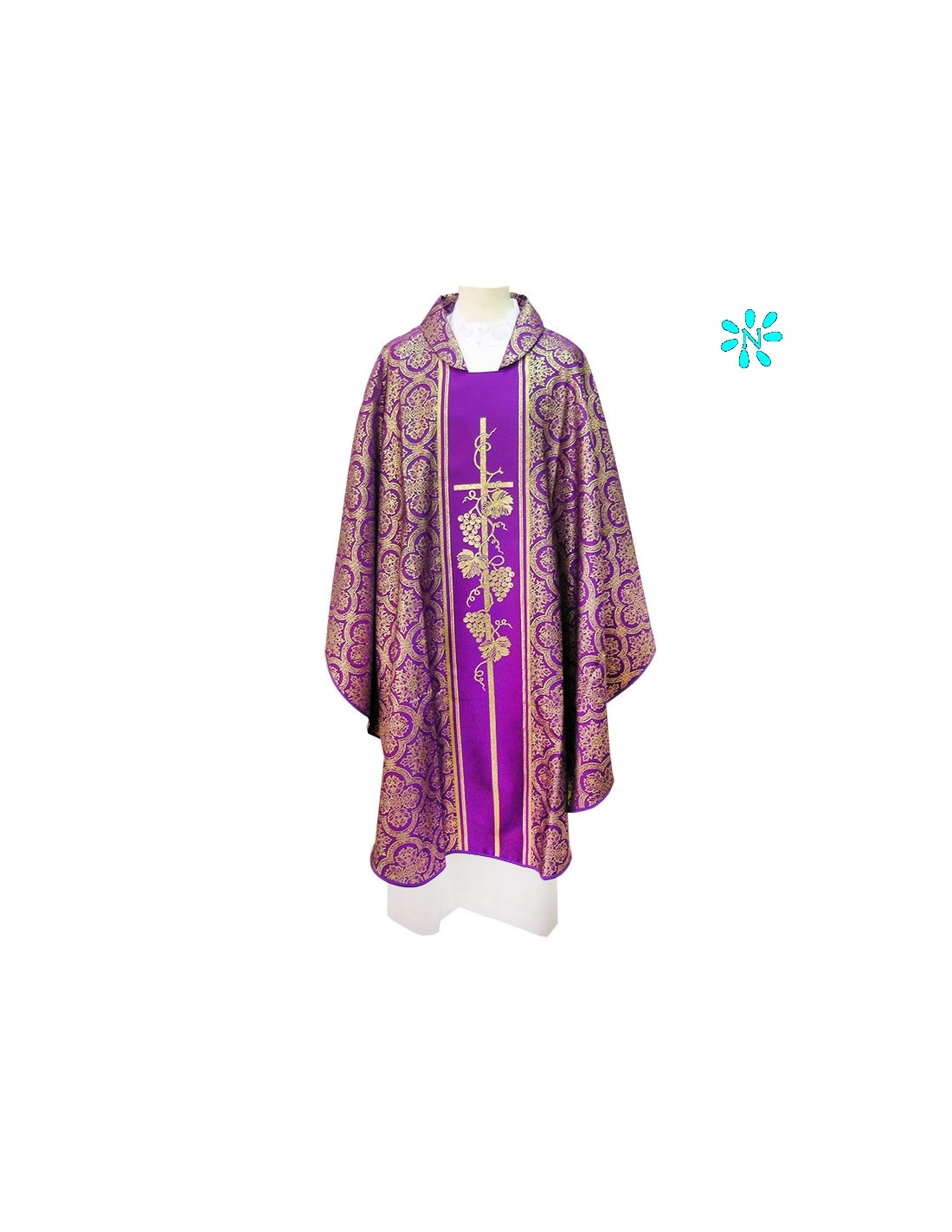 Casulla morada estampada Tipo Damasco, confeccionada en tejido liso de alta calidad. Motivo central de Cruz larga racimos uvas. Cuello abierto a la española, con estola interior incluida. Disponible en más colores litúrgicos. Confeccionada en la UE.