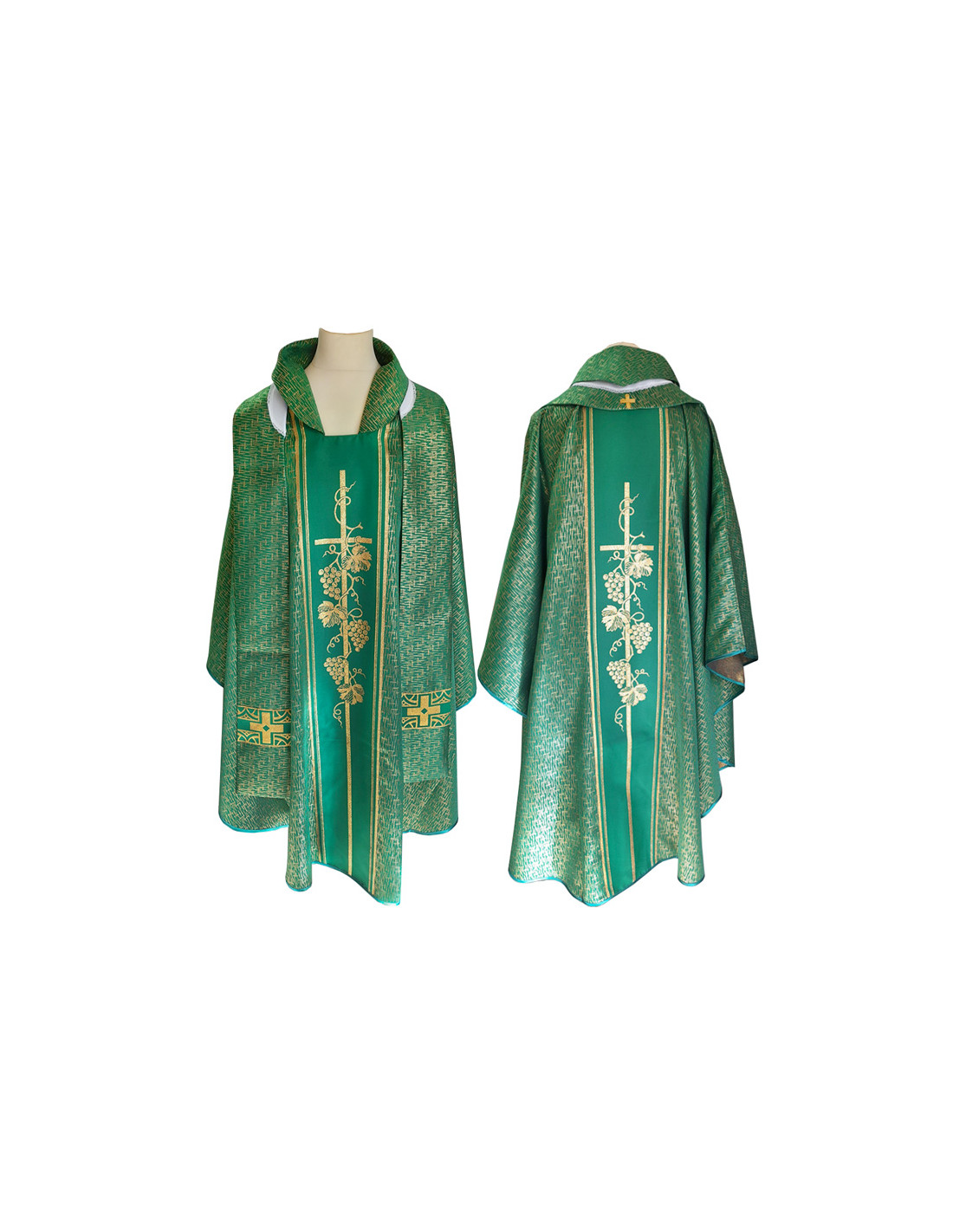 Casulla verde estampada Tipo Damasco, confeccionada en tejido liso de alta calidad. Motivo central de Cruz larga racimos uvas. Cuello abierto a la española, con estola interior incluida. Disponible en más colores litúrgicos. Confeccionada en la UE.