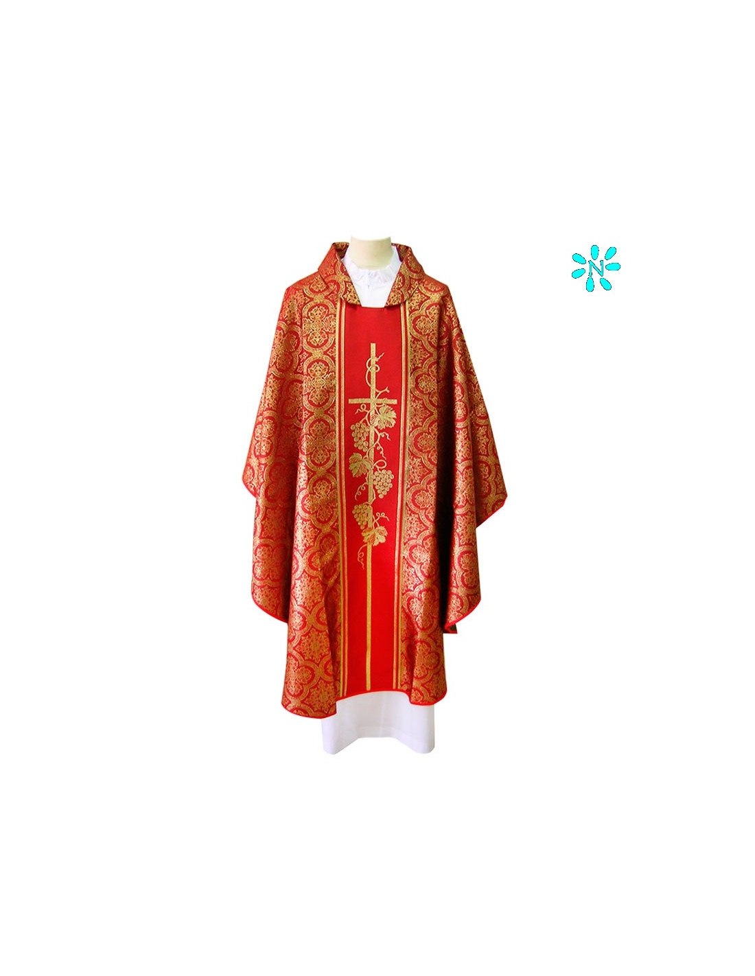 Casulla roja estampada Tipo Damasco, confeccionada en tejido liso de alta calidad. Motivo central de Cruz larga racimos uvas. Cuello abierto a la española, con estola interior incluida. Disponible en más colores litúrgicos. Confeccionada en la UE.