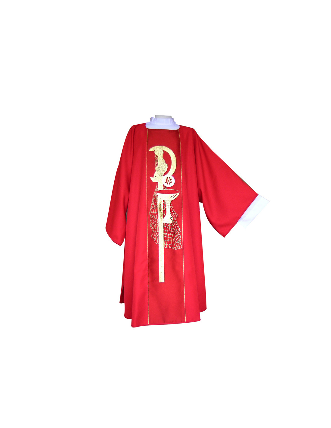 Dalmatica Roja Estampada Con Galon Pax Caliz Forma Y Una Red De Fondo
