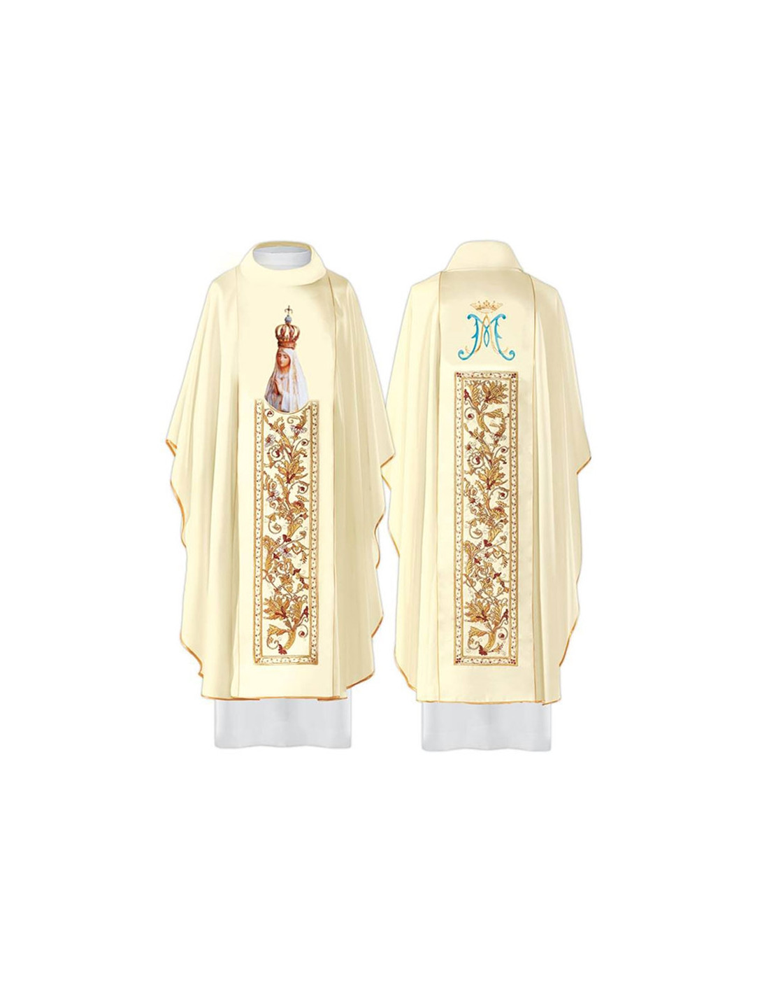 Casulla bordada con galón central rectangular, confeccionada en tejido de alta calidad, y ribeteada en dorado. Motivo central de virgen de fátima bordada con adorno floral. Cuello redondo, con estola interior incluida. Últimas unidades. Confeccionada en la UE.