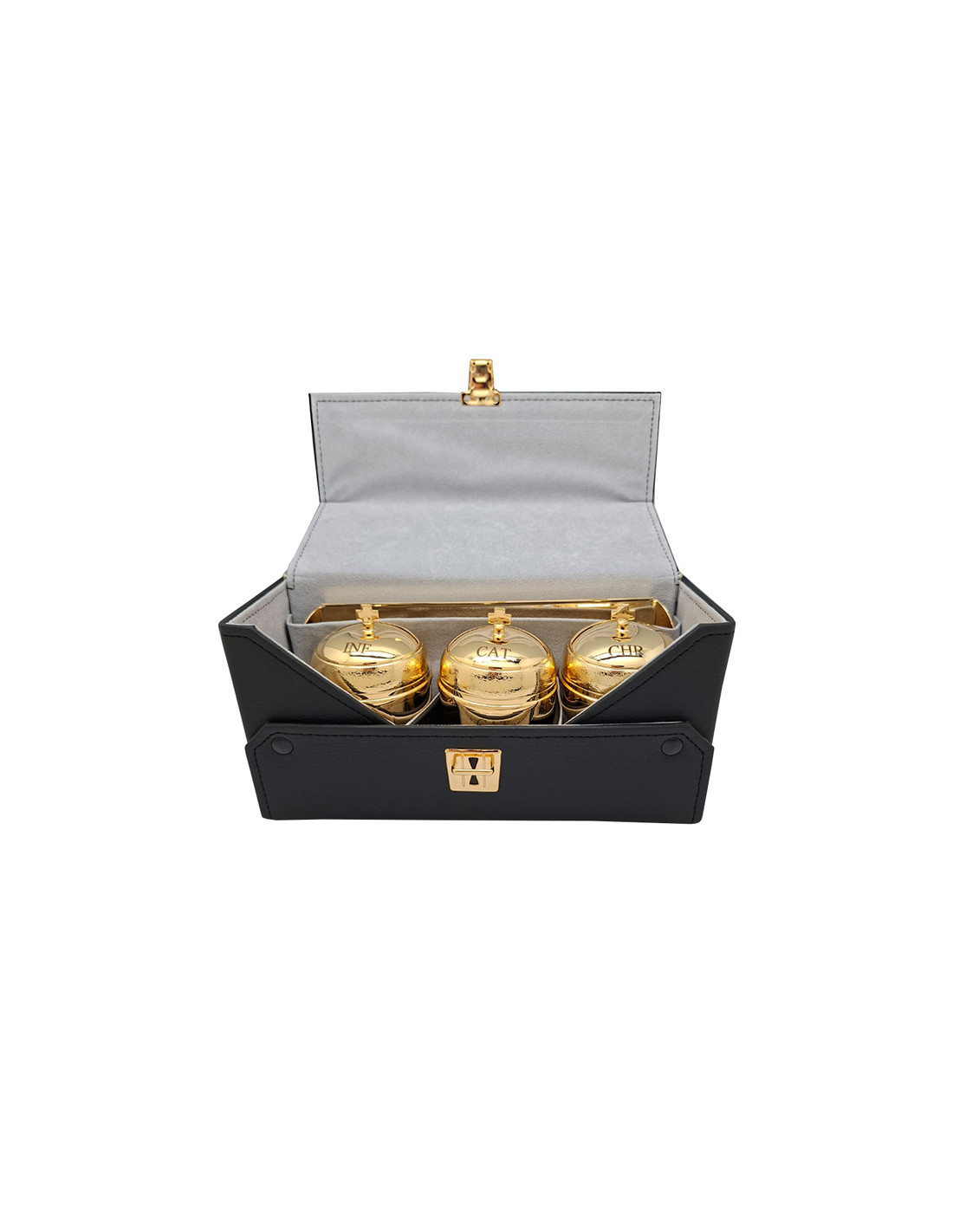 Crismera 3 Vasos Con Bandeja Metal Dorado Y Cristal Interno Estuche Rectangular