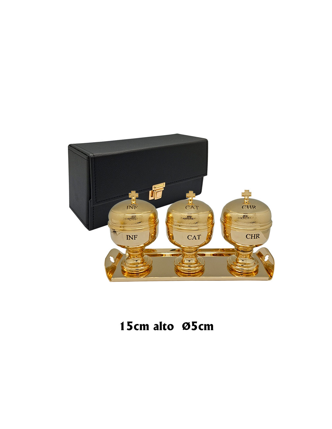 Crismera 3 Vasos Con Bandeja Metal Dorado Y Cristal Interno Estuche Rectangular