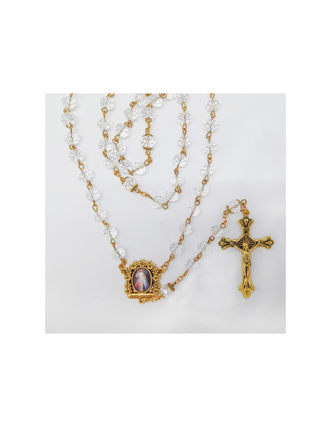 Rosario Cristal Tallado 8x6mm Trasparente Cadena Y Montura Dorado Envejecido