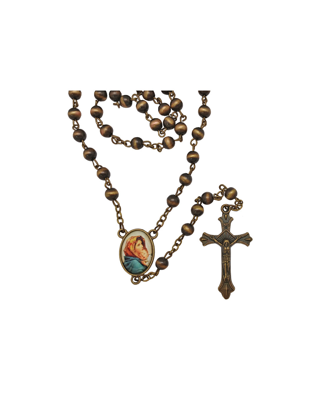 Rosario Cristal liso marron con acabado bronce maria y cruz