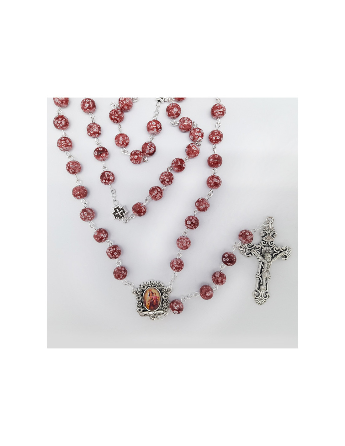 Rosario Cristal 8mm Rojo Con Blanco Estilo Marmol Y Cruz Metal Paters