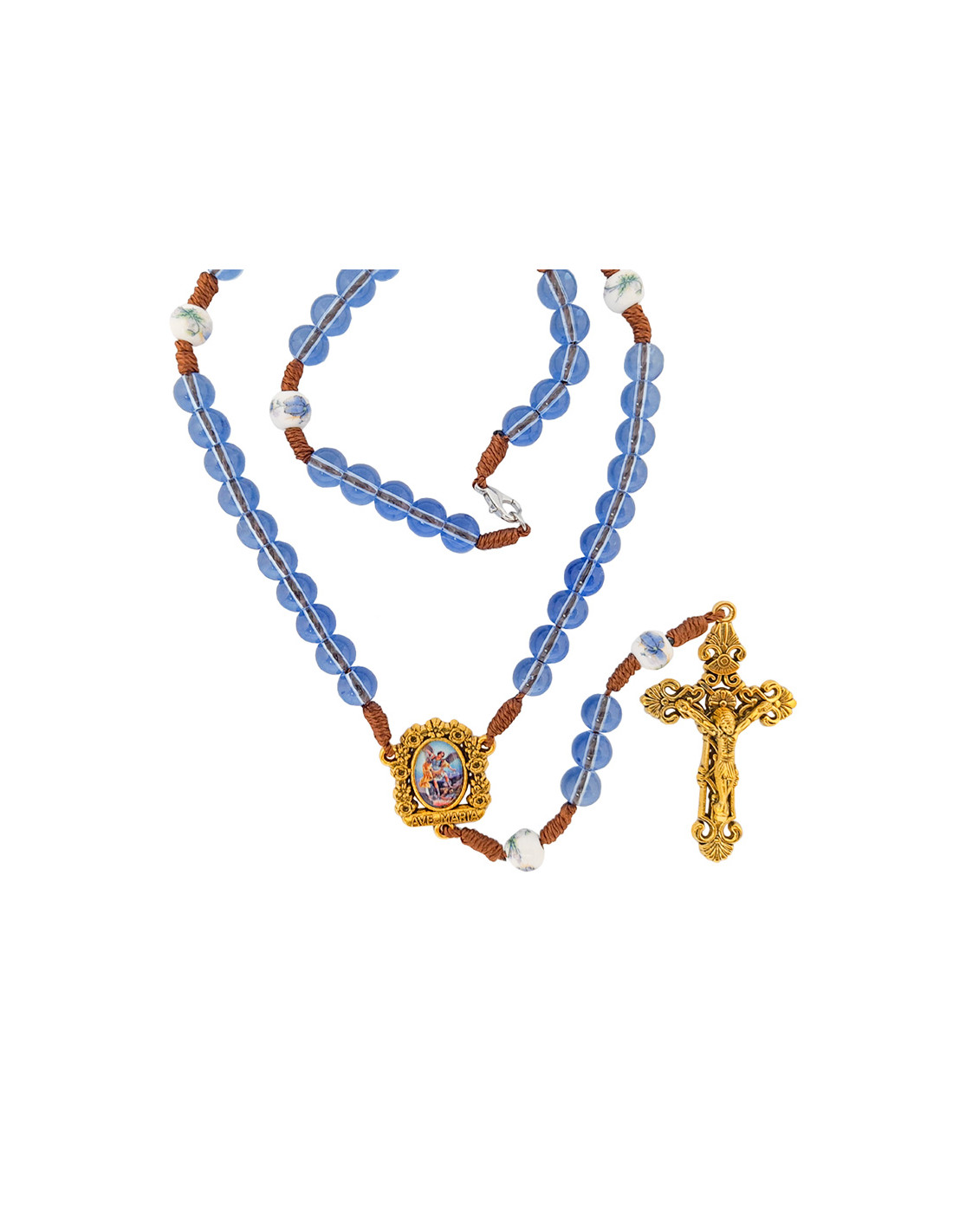 Rosario Cristal Azul Con Cuerda 8Mm Con Paters Ceramica Cruz Y Maria Dorada