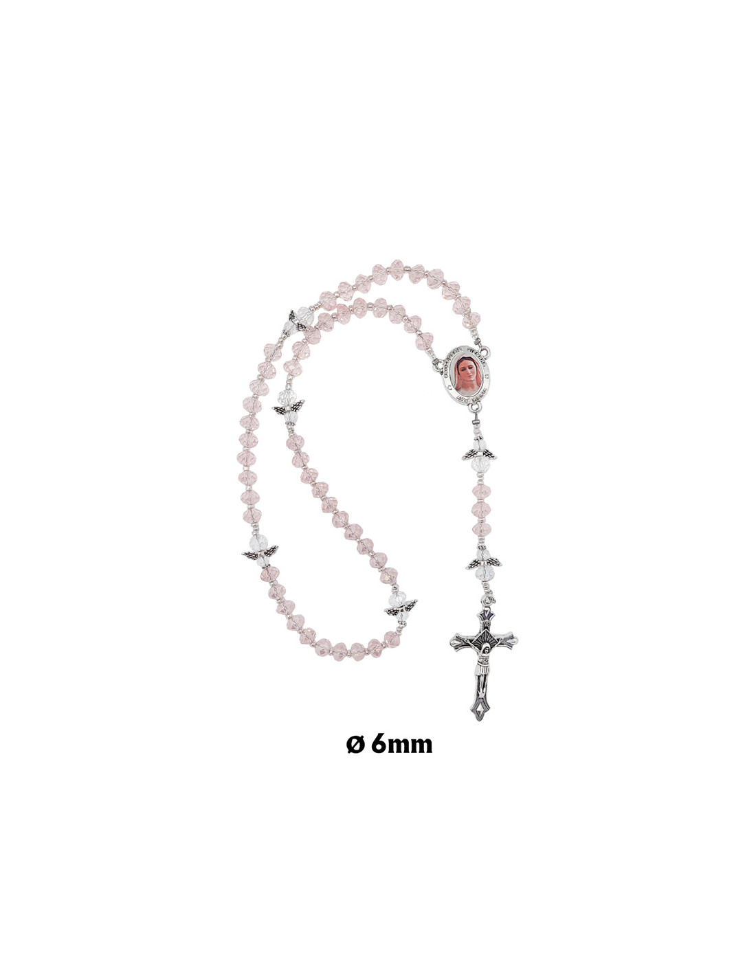 Rosario Cristal Tallado Rosa 6X4mm Paters Angelitos Cristal Alas Metal