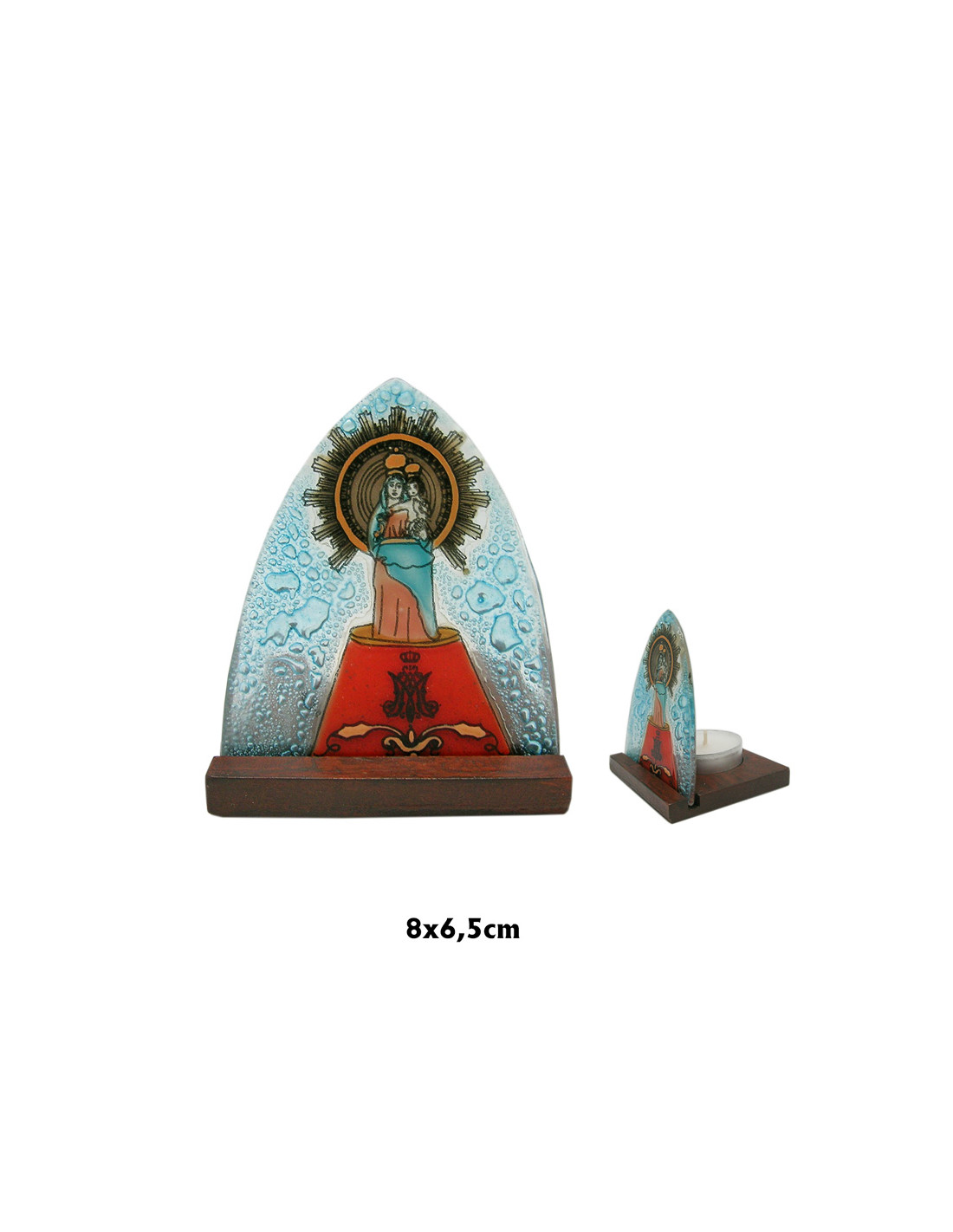 Placa Oval Cristal 9X7cm Virgen Del Pilar De Zaragoza Con Base Madera Y Vela