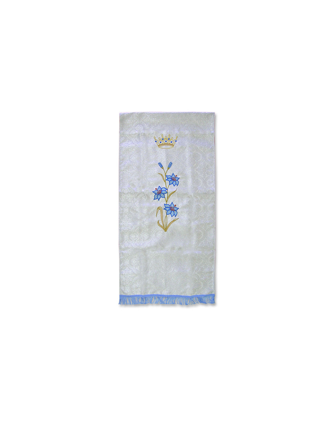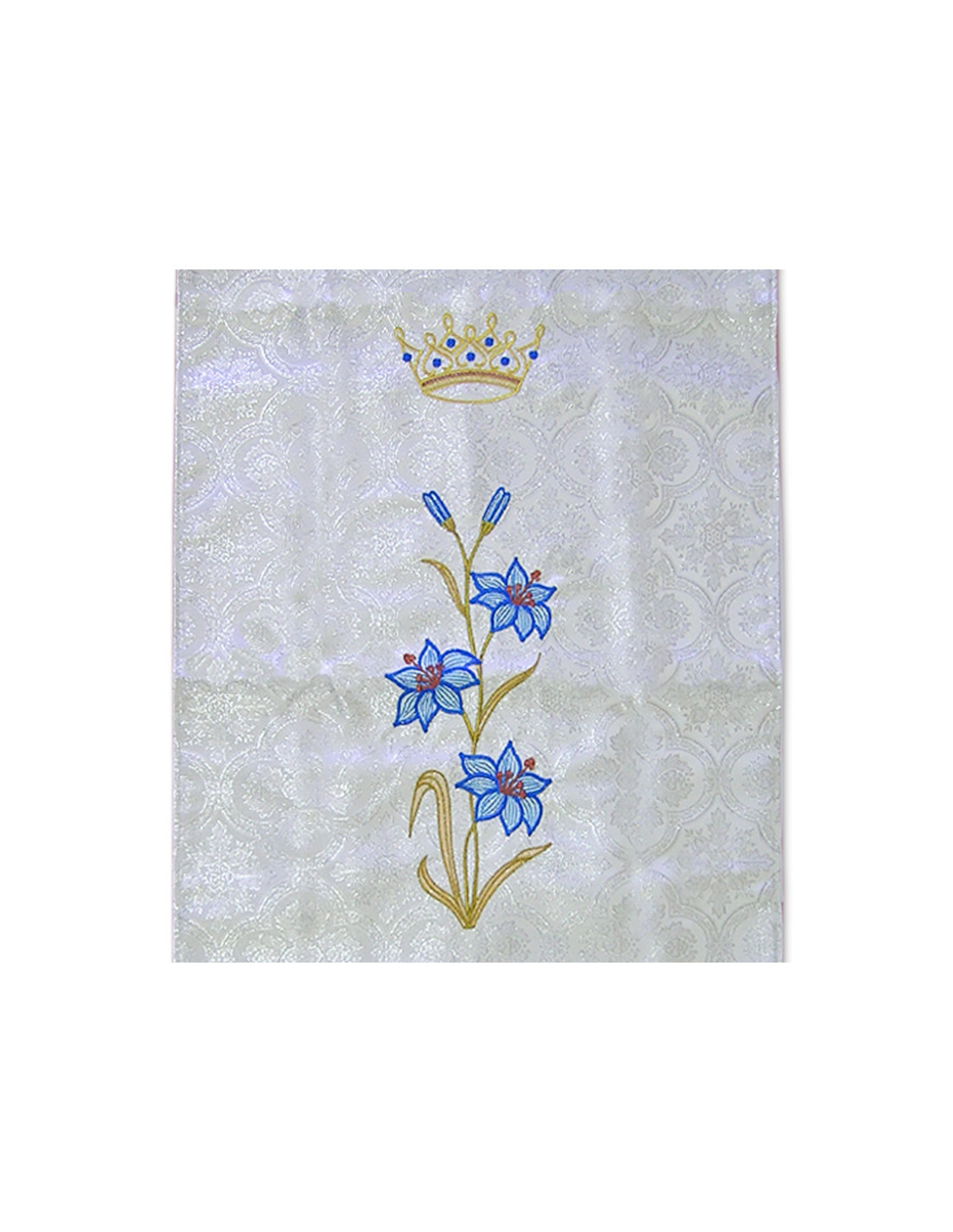 Cubre Ambon Bordado Mariano Tres Flores De Lis Y Corona Arriba Fondo Plateado