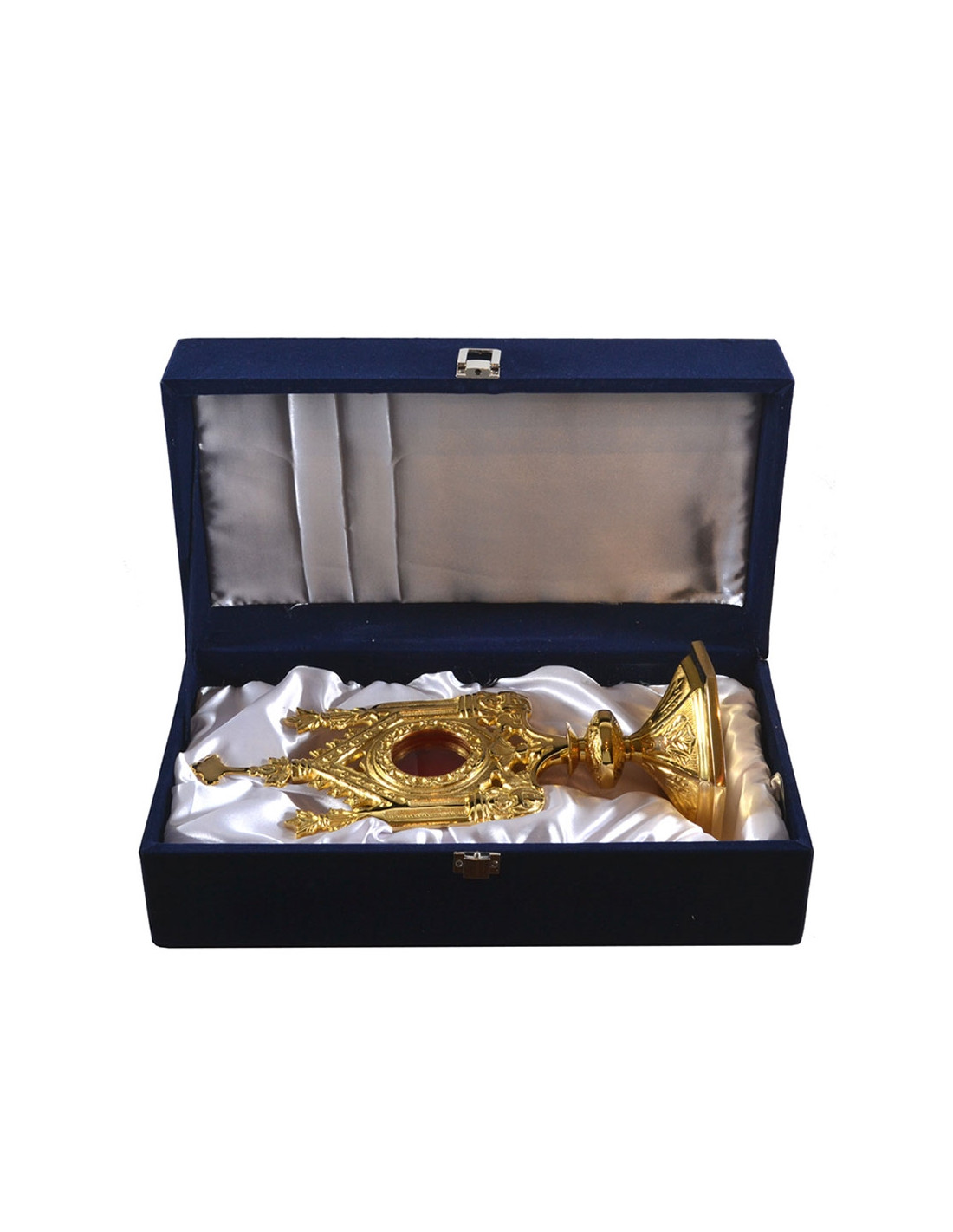 Relicario Dorado 30x13 CM Con Dos Columnas Y Base Hexagonal Labrada En Caja Baño Oro 24k