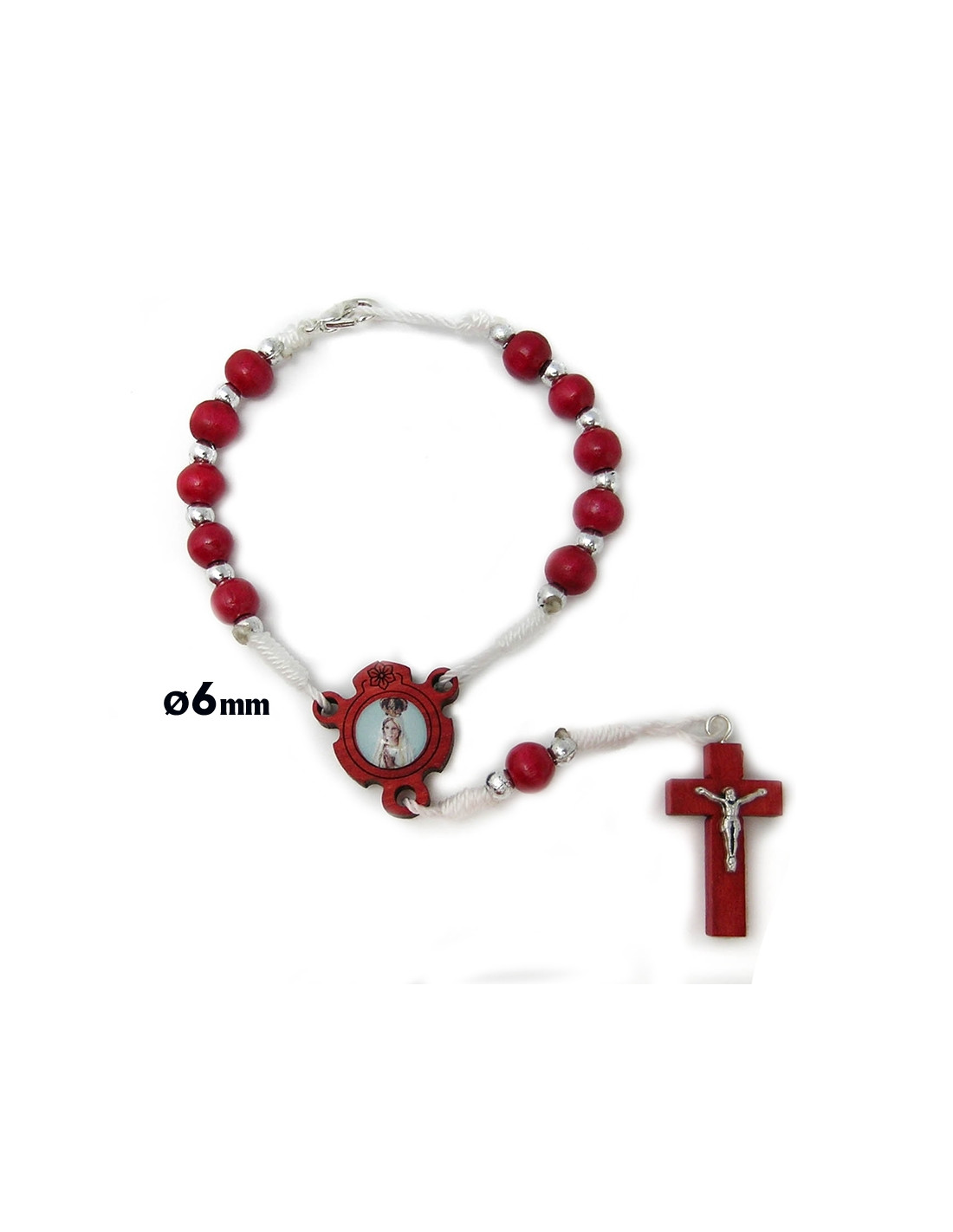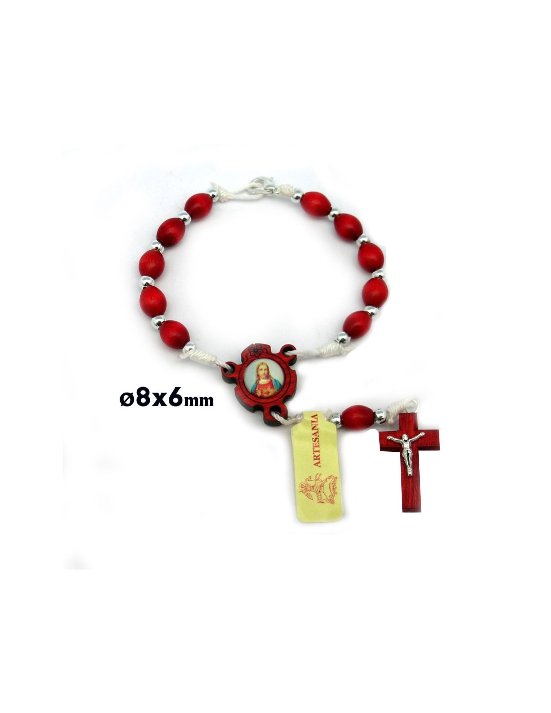 Decena Madera Roja 8X6mm Cuerda Bolitas Metal Cruz Cristo Mosqueton