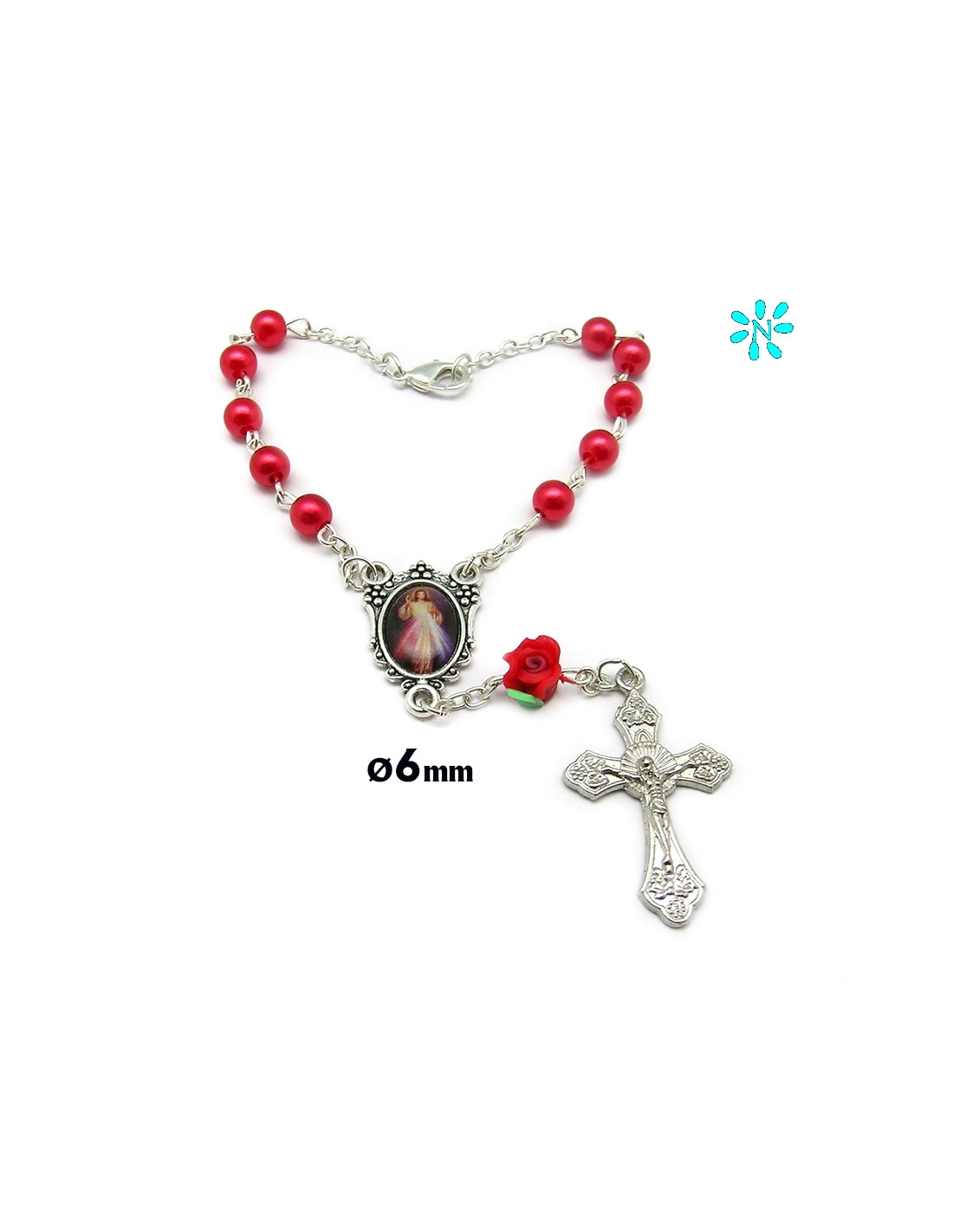 Decena Plastico 6Mm Rojo Con Flor Fimo Roja