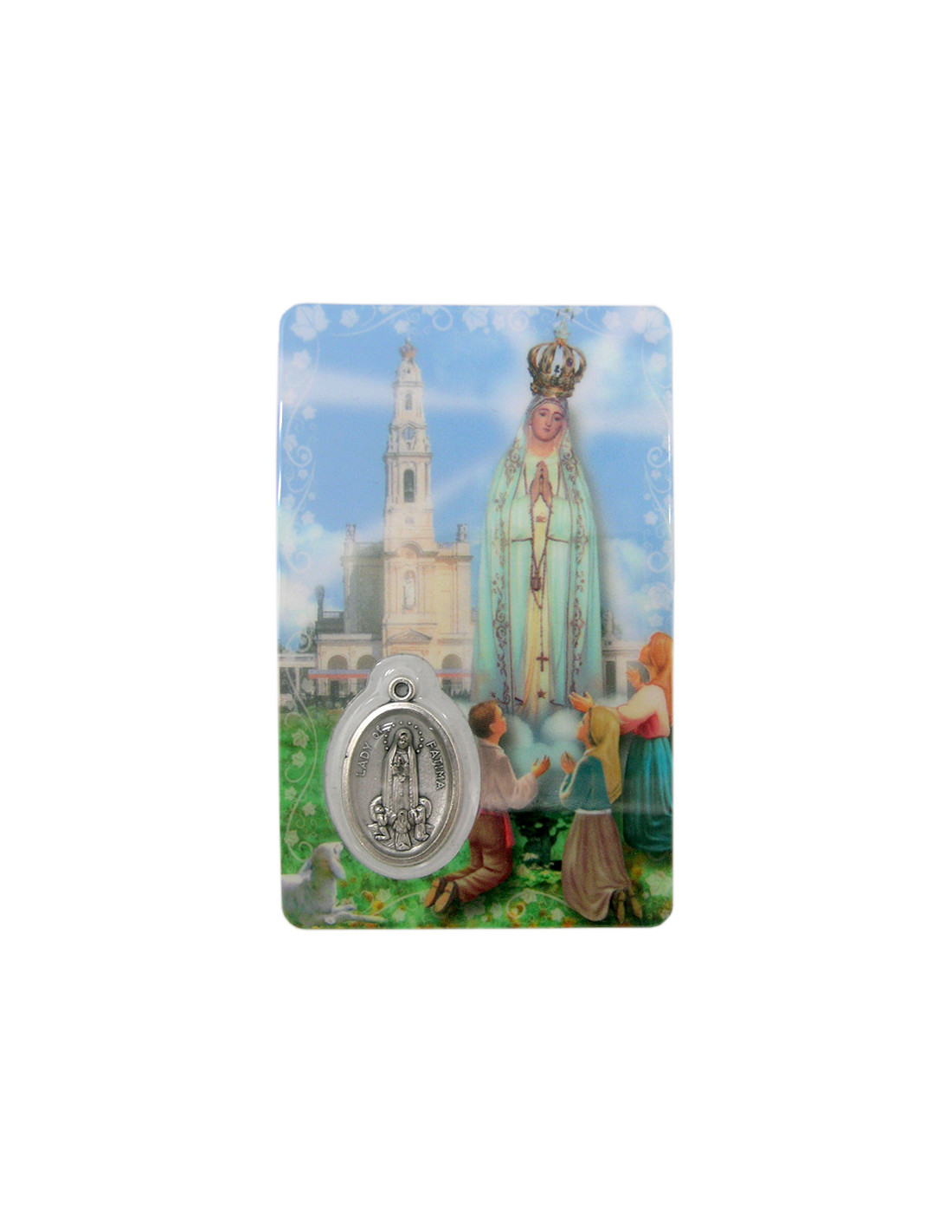Estampa con Medalla de la Virgen De Fatima Coronada. La estampa mide 8x5cm y está realizada íntegramente en plástico en Canadá con un proceso optimizado de tecnología eficiente y sostenible.La medalla se encuentra integrada en la estampa. Ambas cosas le confieren una gran durabilidad, y que el color se mantenga en el tiempo.