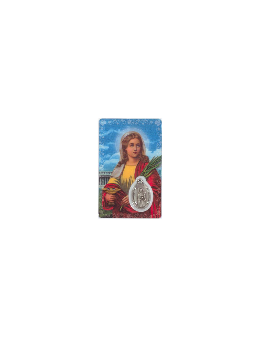 Estampa con Medalla de Santa Lucia. La estampa mide 8x5cm y está realizada íntegramente en plástico en Canadá con un proceso optimizado de tecnología eficiente y sostenible.La medalla se encuentra integrada en la estampa. Ambas cosas le confieren una gran durabilidad, y que el color se mantenga en el tiempo.