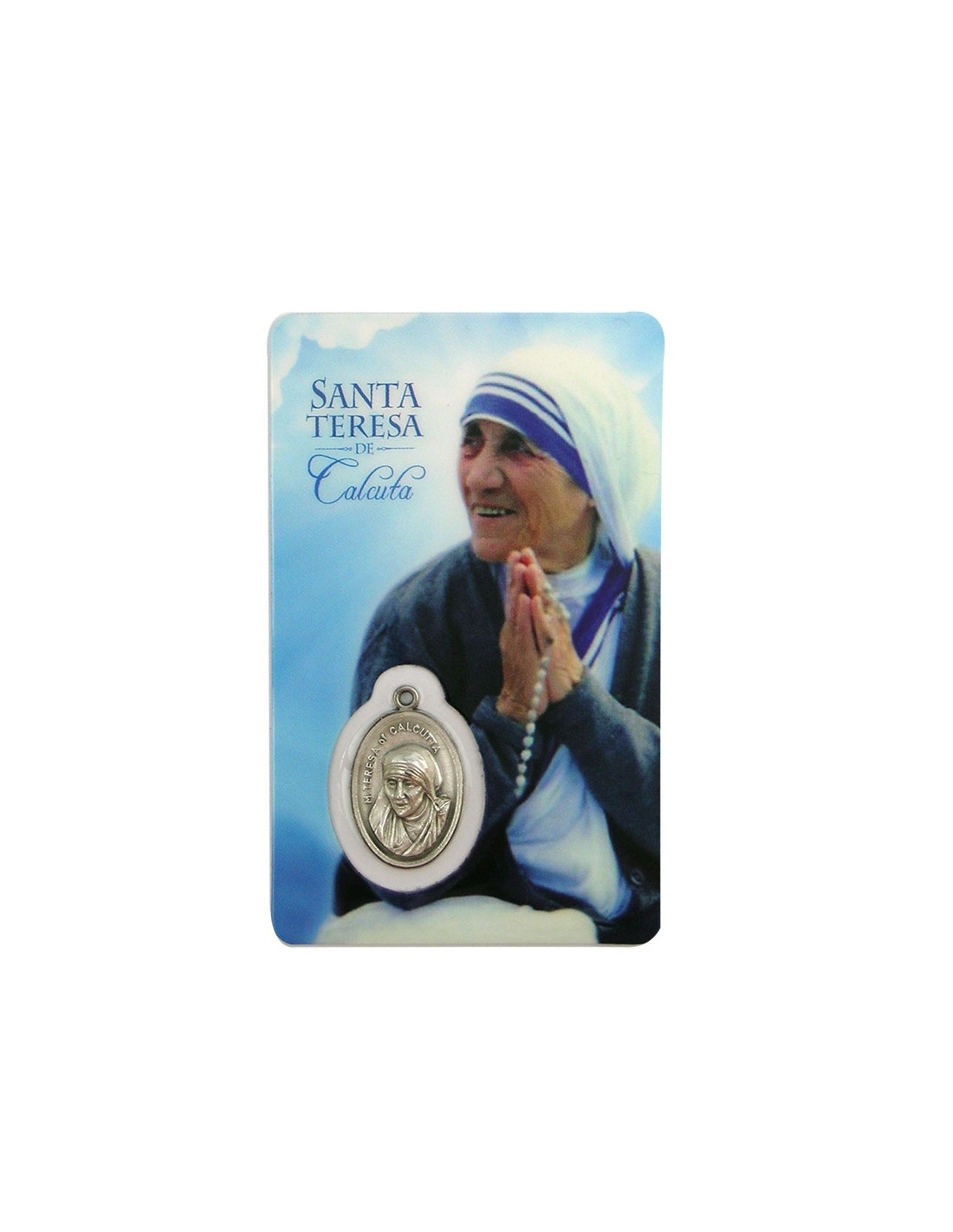 Estampa con Medalla de Santa Teresa De Calcuta. La estampa mide 8x5cm y está realizada íntegramente en plástico en Canadá con un proceso optimizado de tecnología eficiente y sostenible.La medalla se encuentra integrada en la estampa. Ambas cosas le confieren una gran durabilidad, y que el color se mantenga en el tiempo.