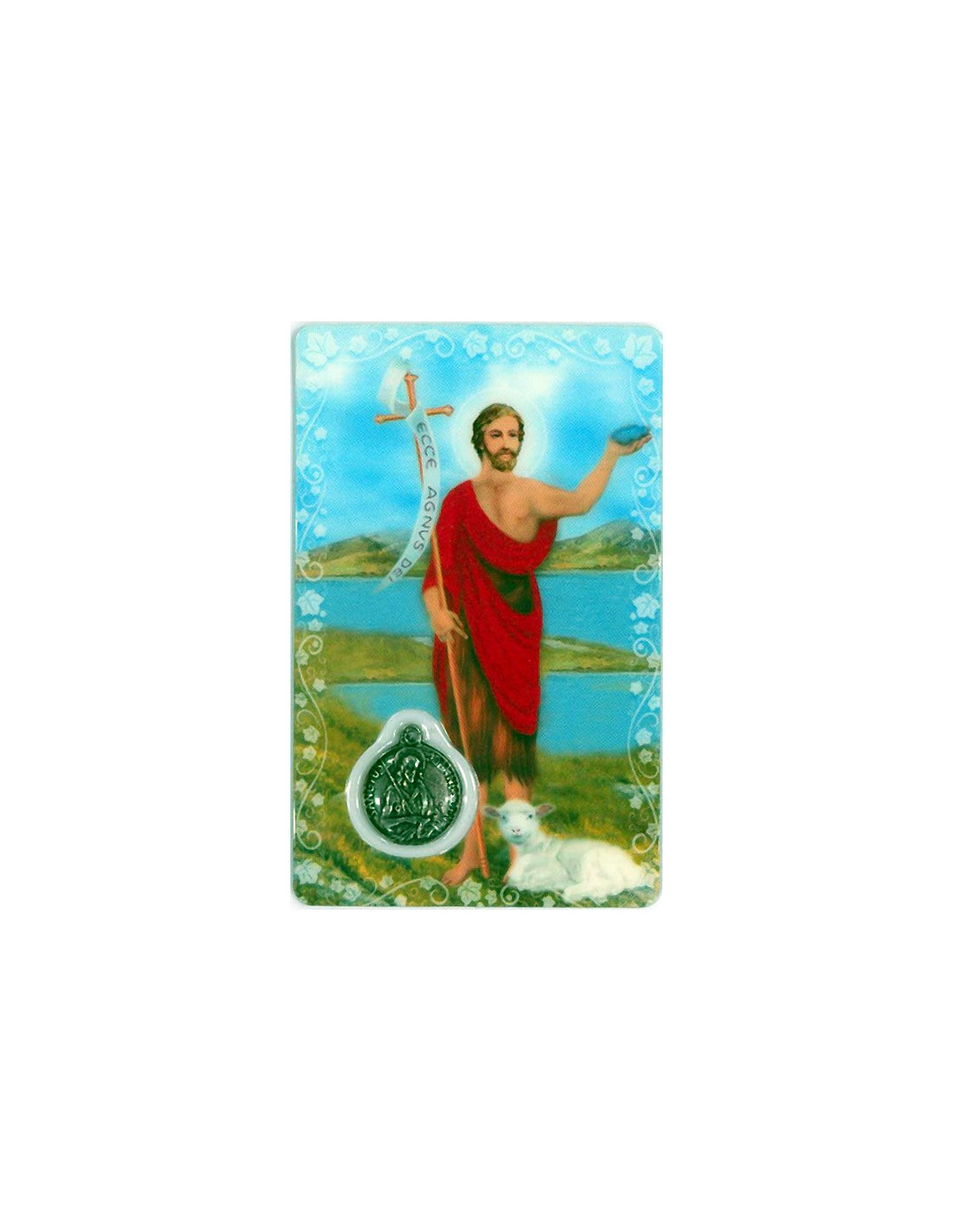Estampa con Medalla de San Juan Bautista. La estampa mide 8x5cm y está realizada íntegramente en plástico en Canadá con un proceso optimizado de tecnología eficiente y sostenible.La medalla se encuentra integrada en la estampa. Ambas cosas le confieren una gran durabilidad, y que el color se mantenga en el tiempo.