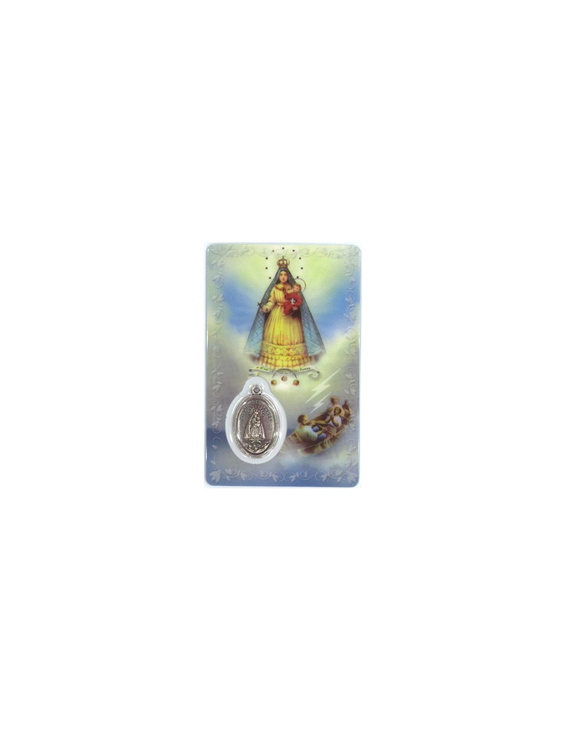 Estampa con Medalla de la Virgen Del Cobre. La estampa mide 8x5cm y está realizada íntegramente en plástico en Canadá con un proceso optimizado de tecnología eficiente y sostenible.La medalla se encuentra integrada en la estampa. Ambas cosas le confieren una gran durabilidad, y que el color se mantenga en el tiempo.