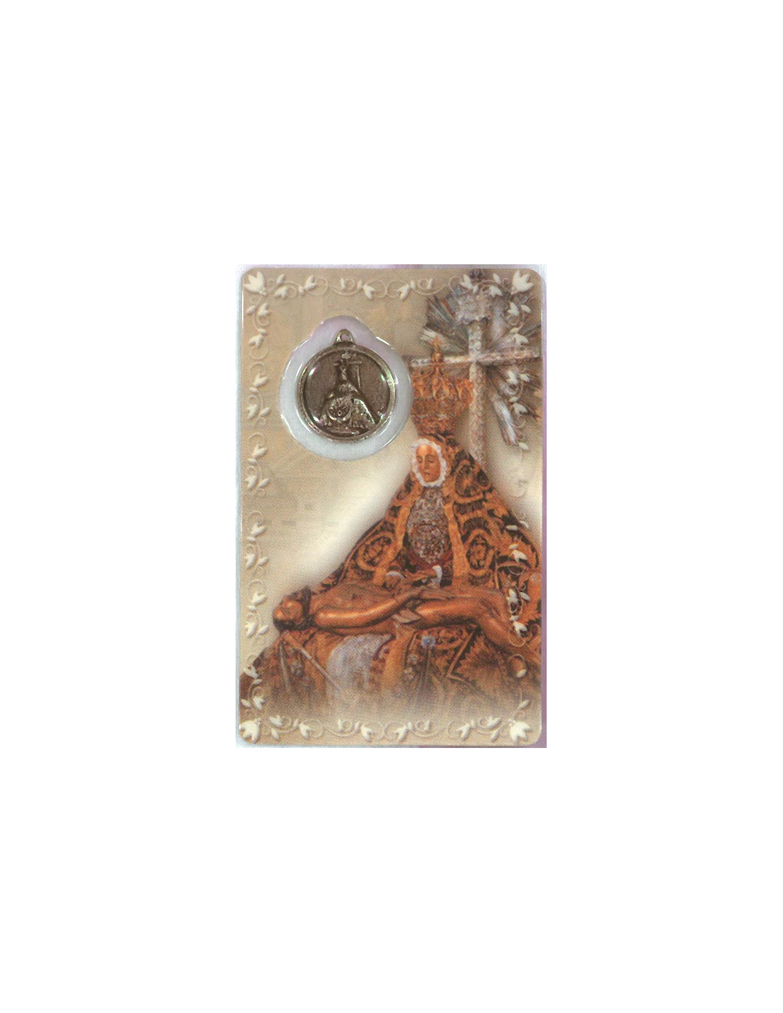 Estampa con Medalla de la Virgen de las Angustias De Granada. La estampa mide 8x5cm y está realizada íntegramente en plástico en Canadá con un proceso optimizado de tecnología eficiente y sostenible.La medalla se encuentra integrada en la estampa. Ambas cosas le confieren una gran durabilidad, y que el color se mantenga en el tiempo.
