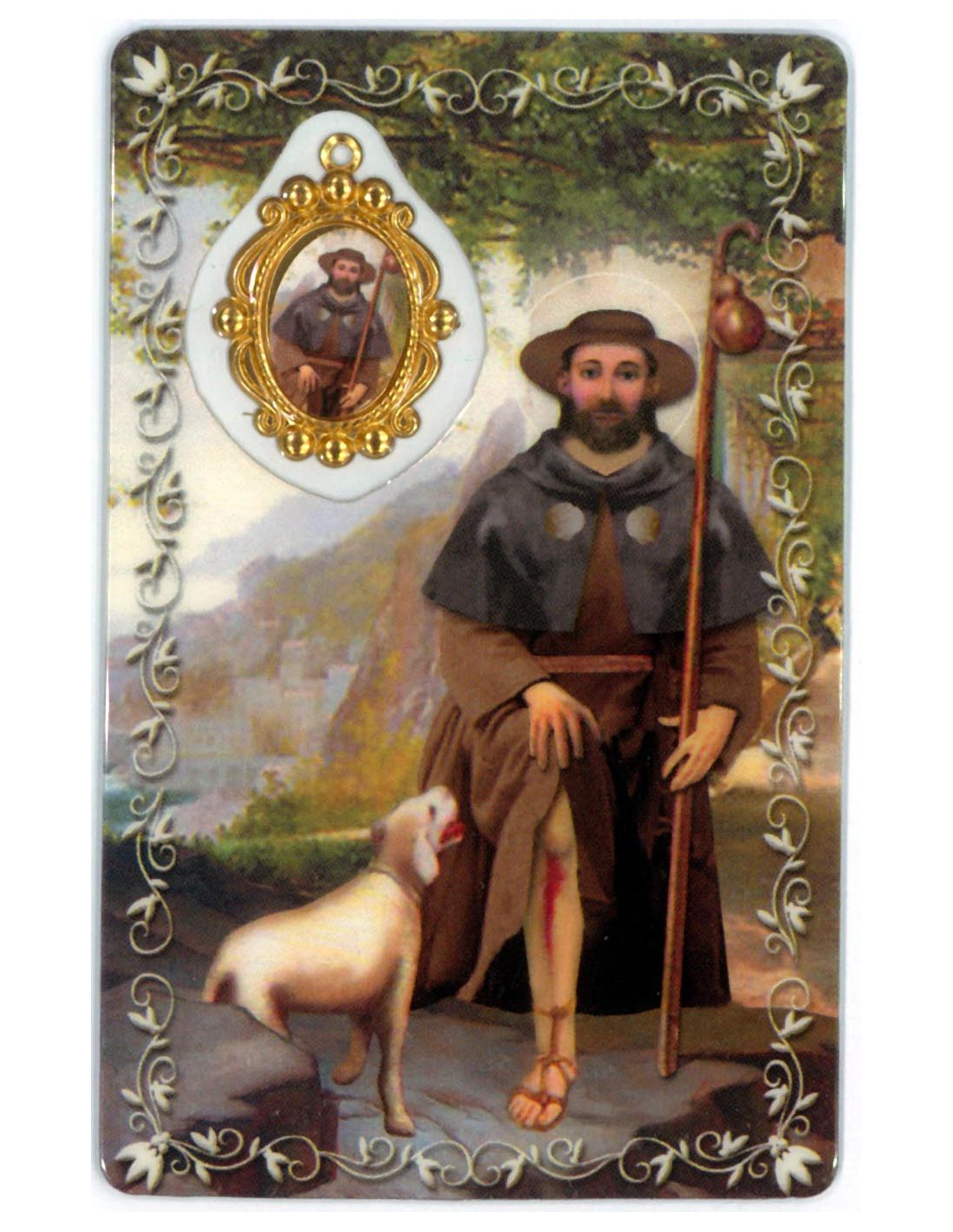 Estampa con Medalla de San Roque. La estampa mide 8x5cm y está realizada íntegramente en plástico en Canadá con un proceso optimizado de tecnología eficiente y sostenible.La medalla se encuentra integrada en la estampa. Ambas cosas le confieren una gran durabilidad, y que el color se mantenga en el tiempo.