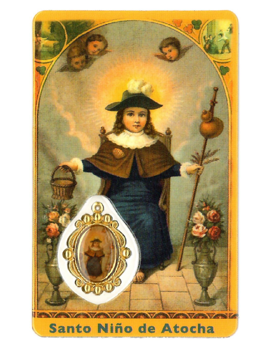 Estampa con Medalla de Santo Niño De Atocha. La estampa mide 8x5cm y está realizada íntegramente en plástico en Canadá con un proceso optimizado de tecnología eficiente y sostenible.La medalla se encuentra integrada en la estampa. Ambas cosas le confieren una gran durabilidad, y que el color se mantenga en el tiempo.
