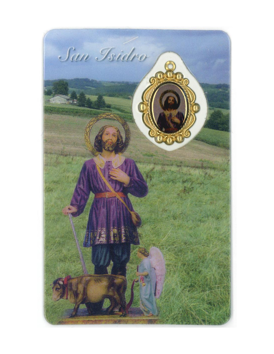 Estampa con Medalla de San Isidro Labrador En Los Campos. La estampa mide 8x5cm y está realizada íntegramente en plástico en Canadá con un proceso optimizado de tecnología eficiente y sostenible.La medalla se encuentra integrada en la estampa. Ambas cosas le confieren una gran durabilidad, y que el color se mantenga en el tiempo.