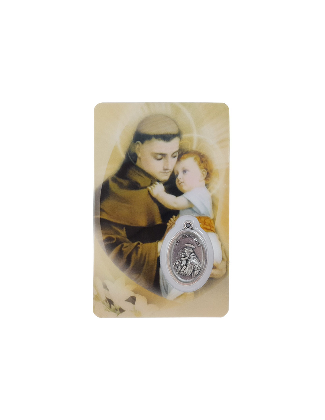 Estampa con Medalla de San Antonio Serie luz. La estampa mide 8x5cm y está realizada íntegramente en plástico en Canadá con un proceso optimizado de tecnología eficiente y sostenible.La medalla se encuentra integrada en la estampa. Ambas cosas le confieren una gran durabilidad, y que el color se mantenga en el tiempo.