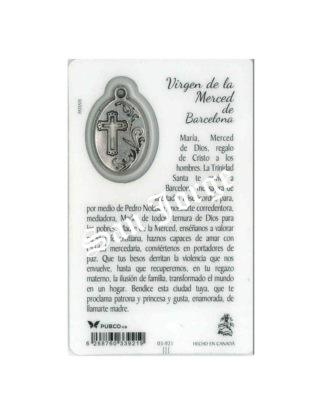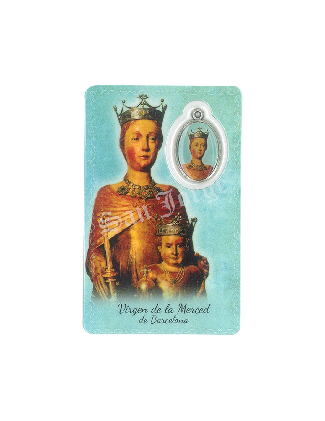 Estampa con Medalla de la Virgen de la Merced De Barcelona. La estampa mide 8x5cm y está realizada íntegramente en plástico en Canadá con un proceso optimizado de tecnología eficiente y sostenible.La medalla se encuentra integrada en la estampa. Ambas cosas le confieren una gran durabilidad, y que el color se mantenga en el tiempo.