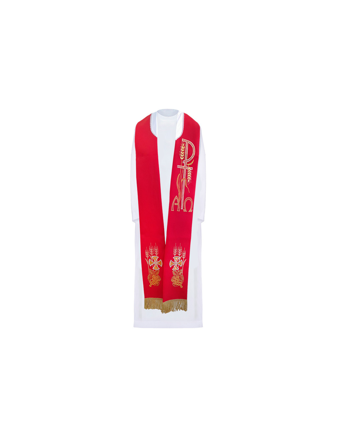 Estola Bordada Ancha Pax Alfa Y Omega Con Cruz Cuadrada 3 Espigas Flecos N133 Roja