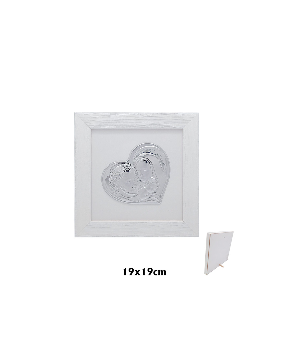 Corazon Sagrada Familia Plata 8 X 10. 5Cm Sobre Madera Blanca Con Marco