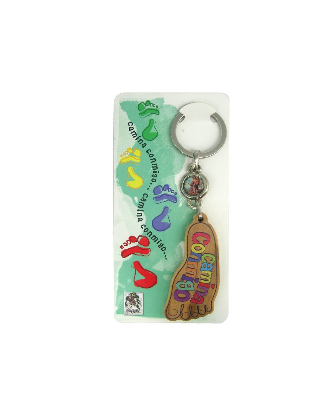 Llavero Madera Olivo Pie Camina Conmigo En Color Y En Blister