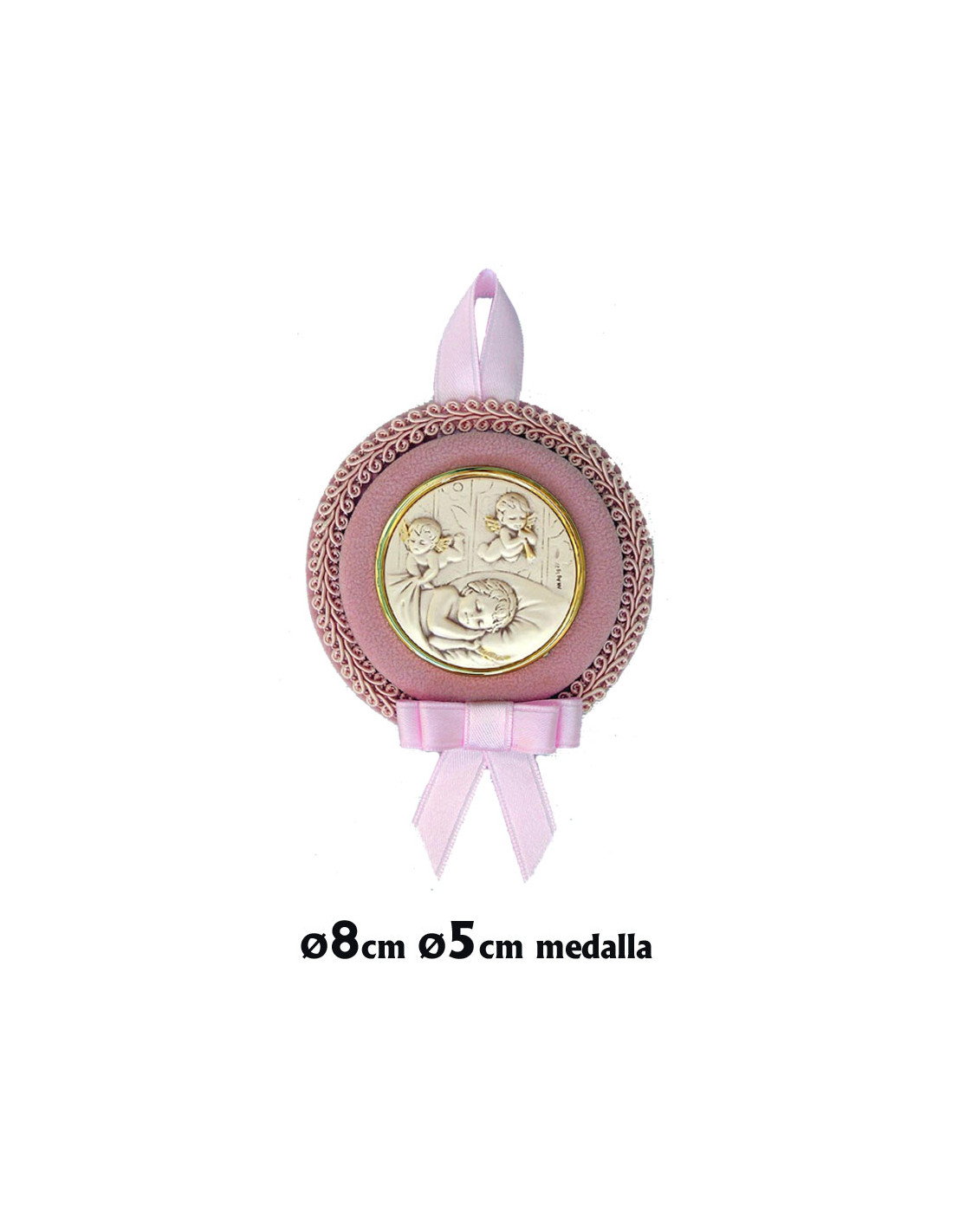 Medalla Cuna Placa Aluminio Niño Y Angeles Musicos Sobre Tejido Y Cordon Rosa 8Cm