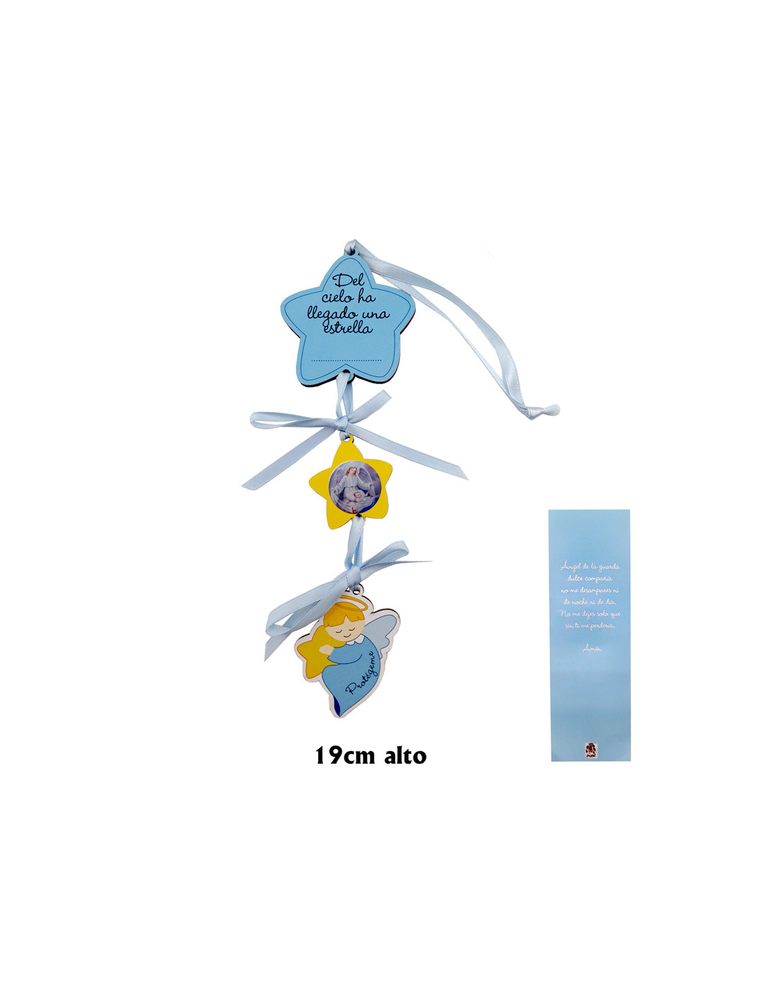 Medalla Cuna Estrella Con Texto Y Angelito Durmiendo Fondo Azul En Blister