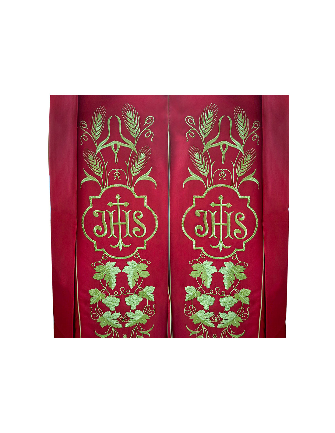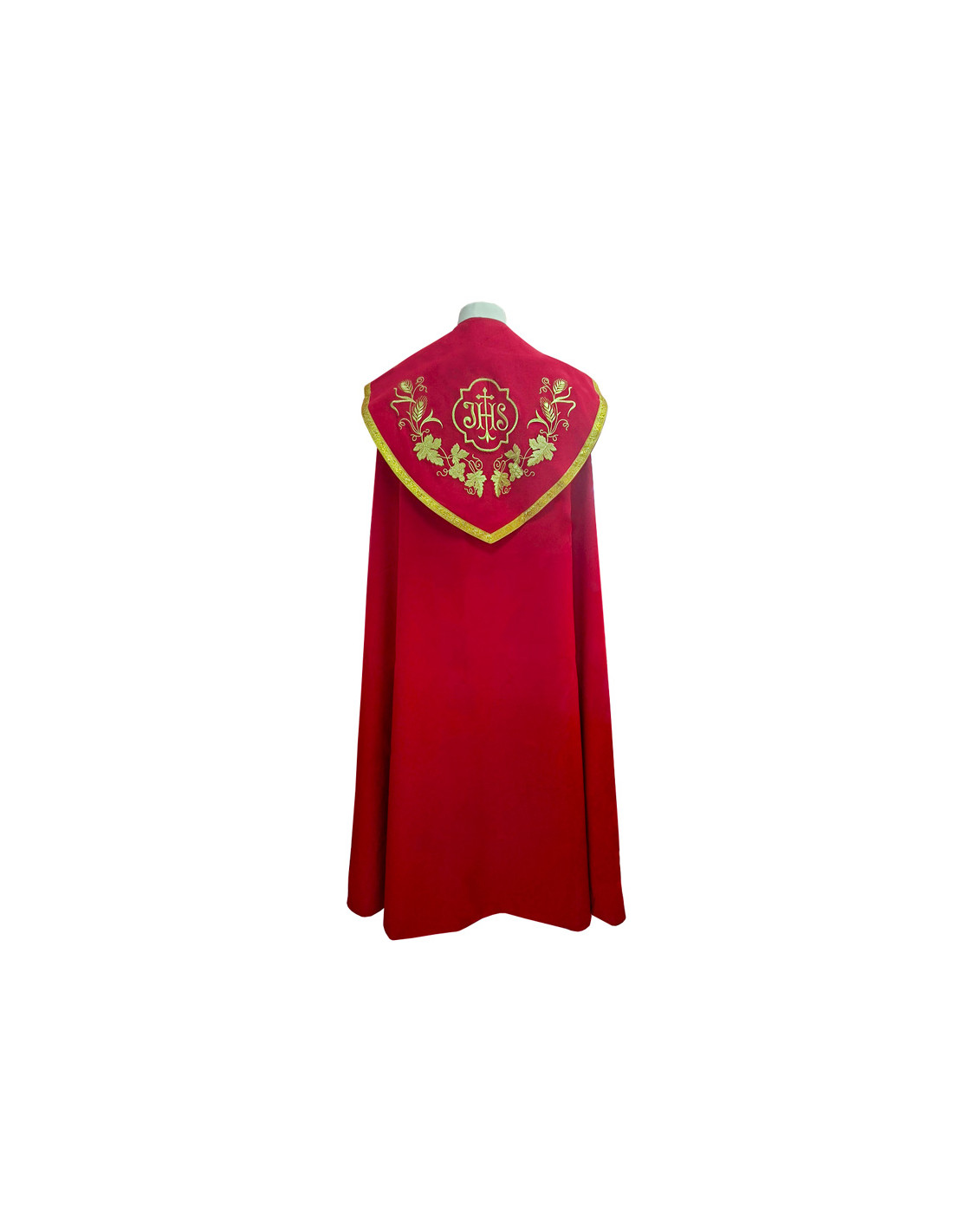 Capa Pluvial Bordada Jhs Con Cruz Larga En Roseton Espigas Y Uvas Roja