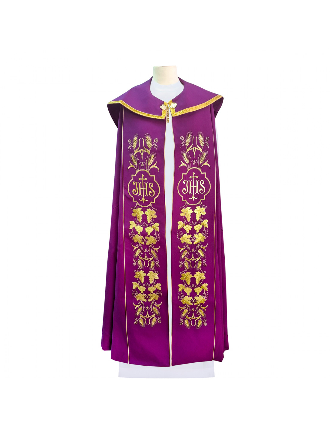 Capa Pluvial Bordada Jhs Con Cruz Larga En Roseton Espigas Y Uvas Morada