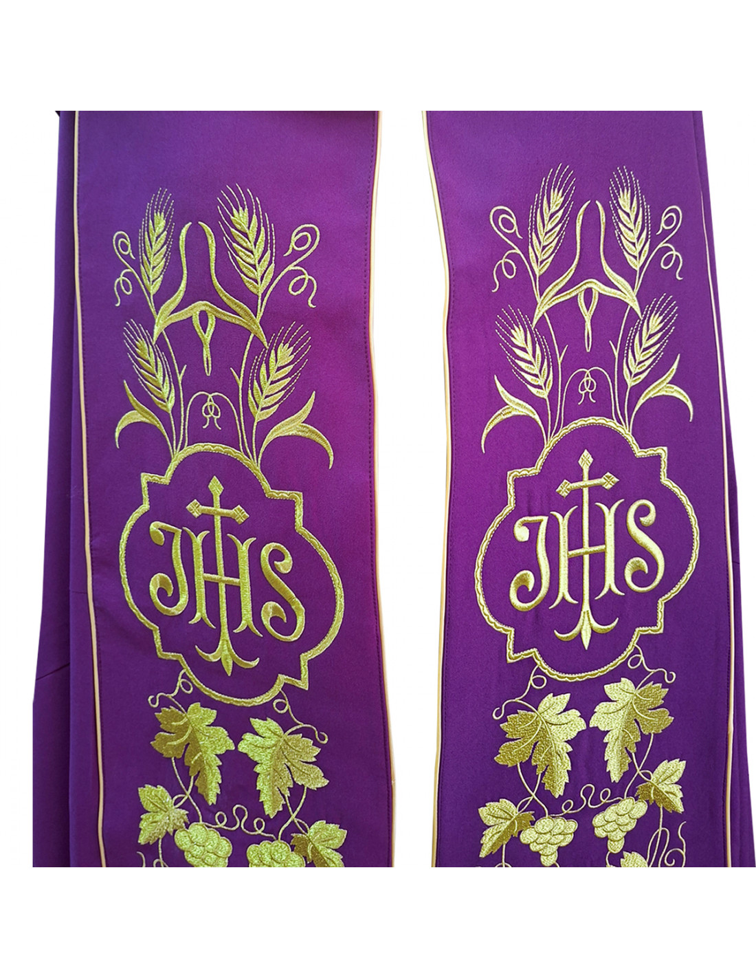 Capa Pluvial Bordada Jhs Con Cruz Larga En Roseton Espigas Y Uvas Morada