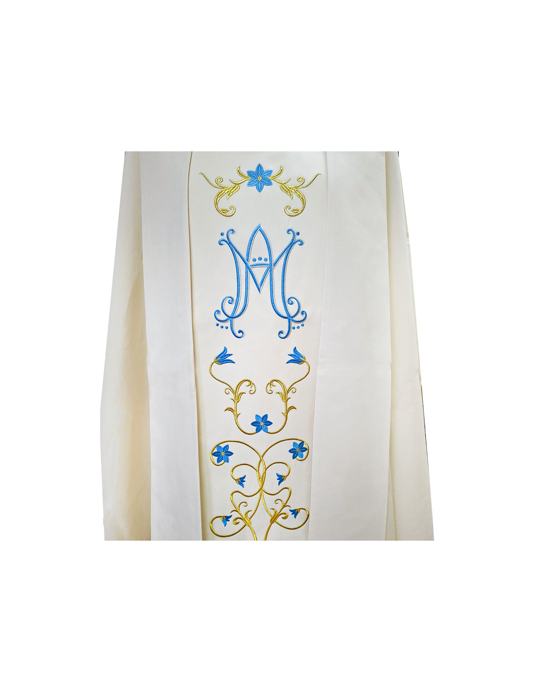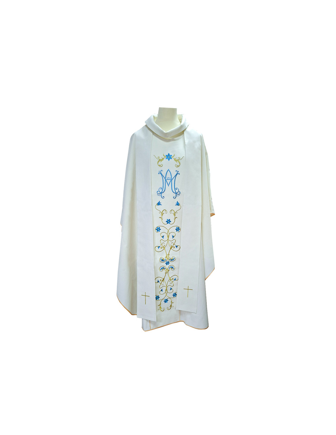 Casulla Bordada Mariana Flores Azules Y Dorado Sobre Galon Central