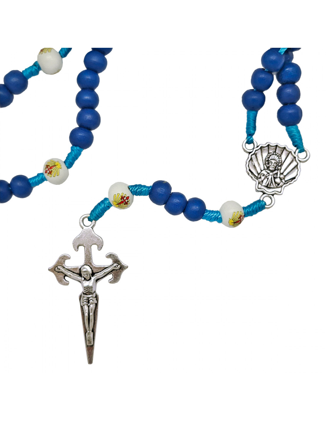 Rosario Madera Y Cuerda Santiago 6X7mm Azul Paters Blancos Serigrafiados Mosqueton