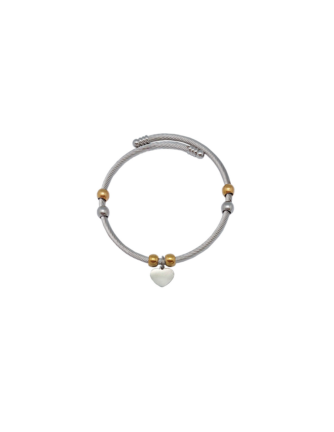 Pulsera Acero Blanco Rayado Con Bolitas Doradas Y Colgante
