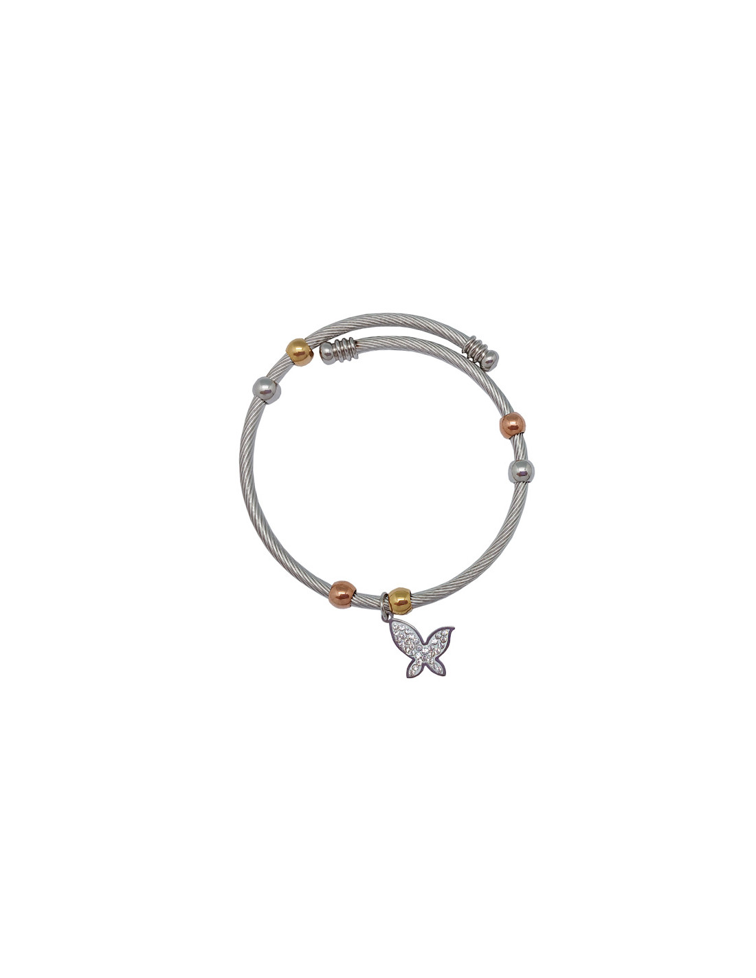 Pulsera Acero Blanco Rayado Con Bolitas Doradas Y Colgante