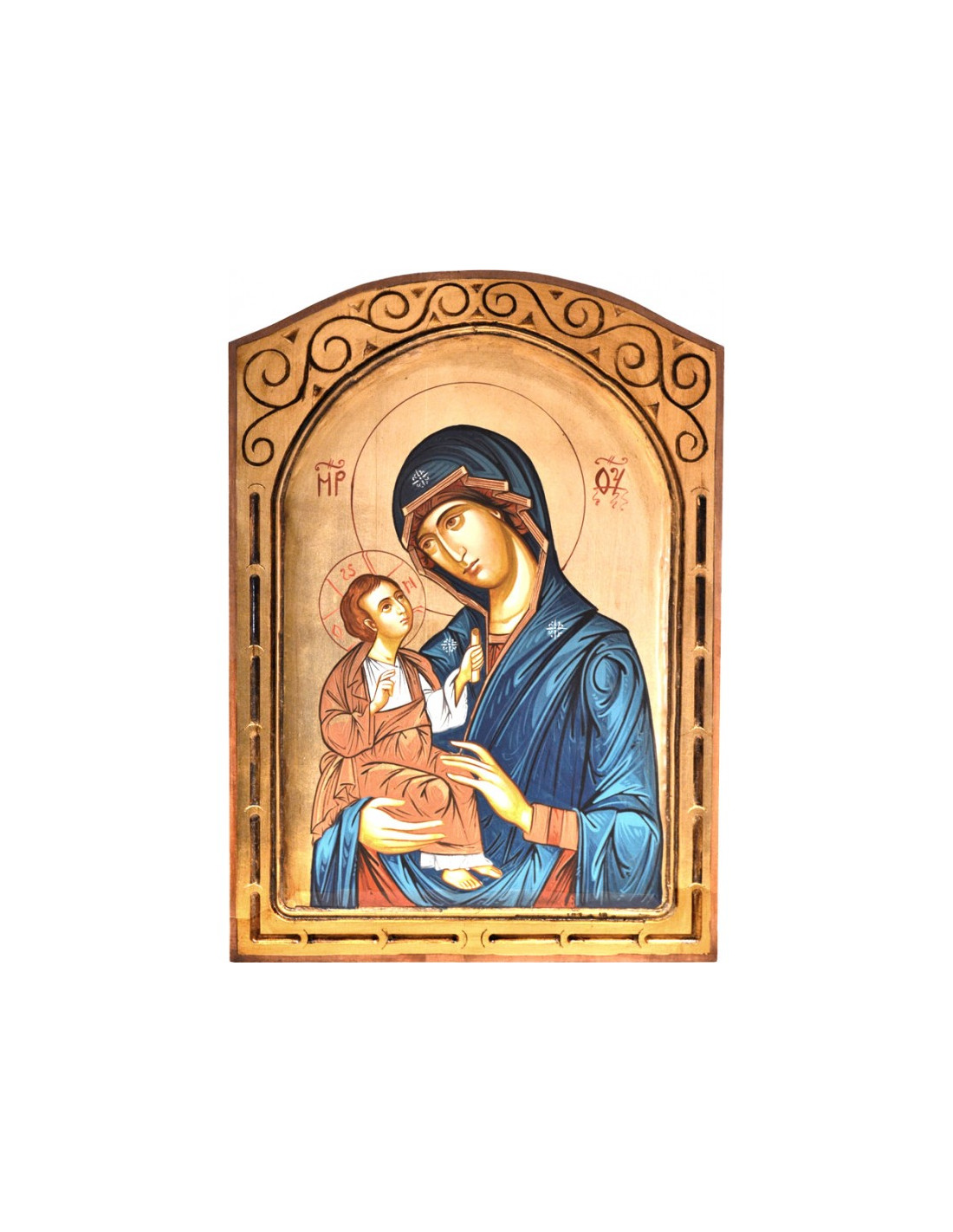 Icono Madera Pintado A Mano Forma Cupula 44X32cm Virgen Con Niño Manto Azul Borde Tallado