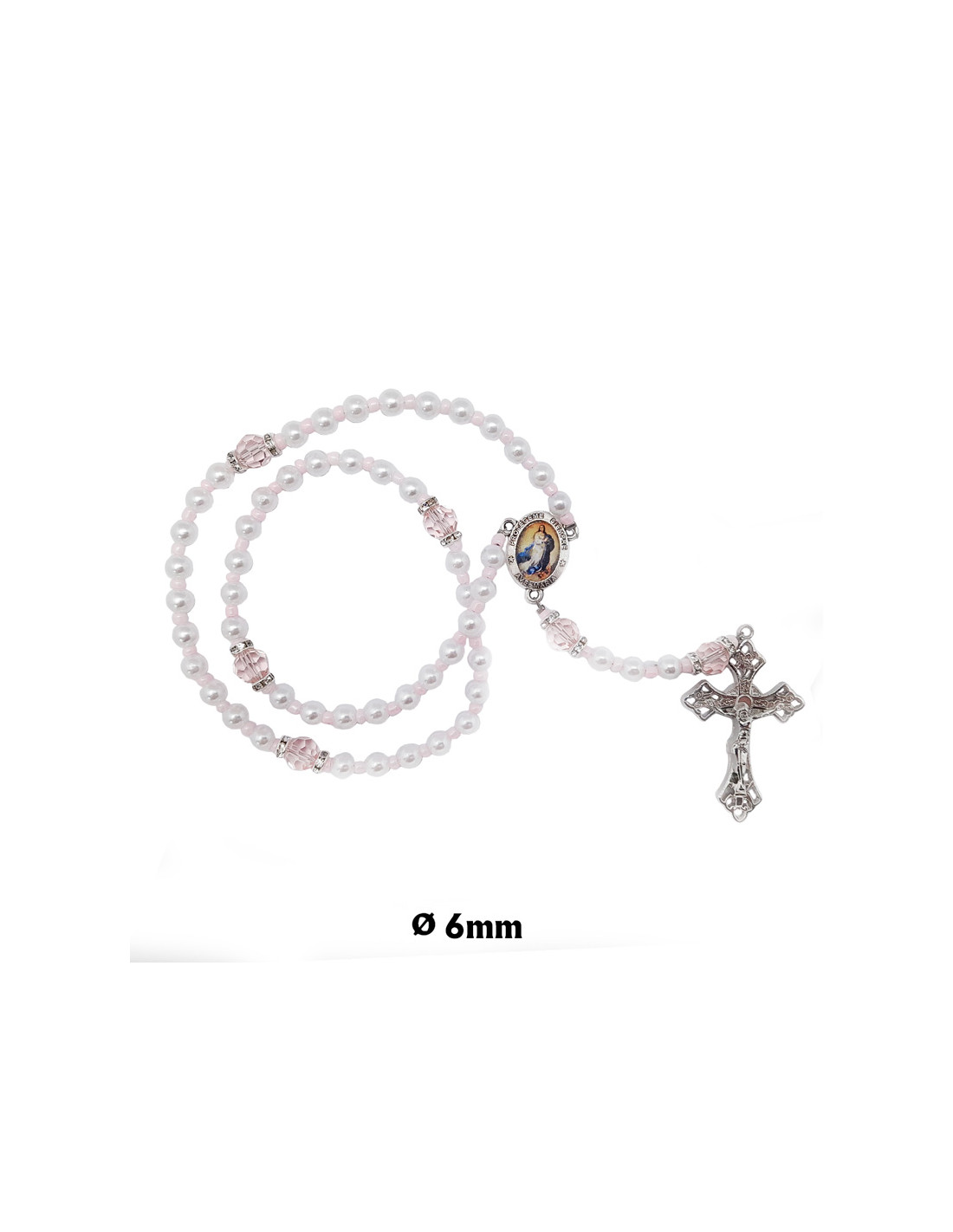 Rosario Plastico Perla Blanca 6Mm Con Paters Cristal Rosa Y Discos Imitacion Zirconitas