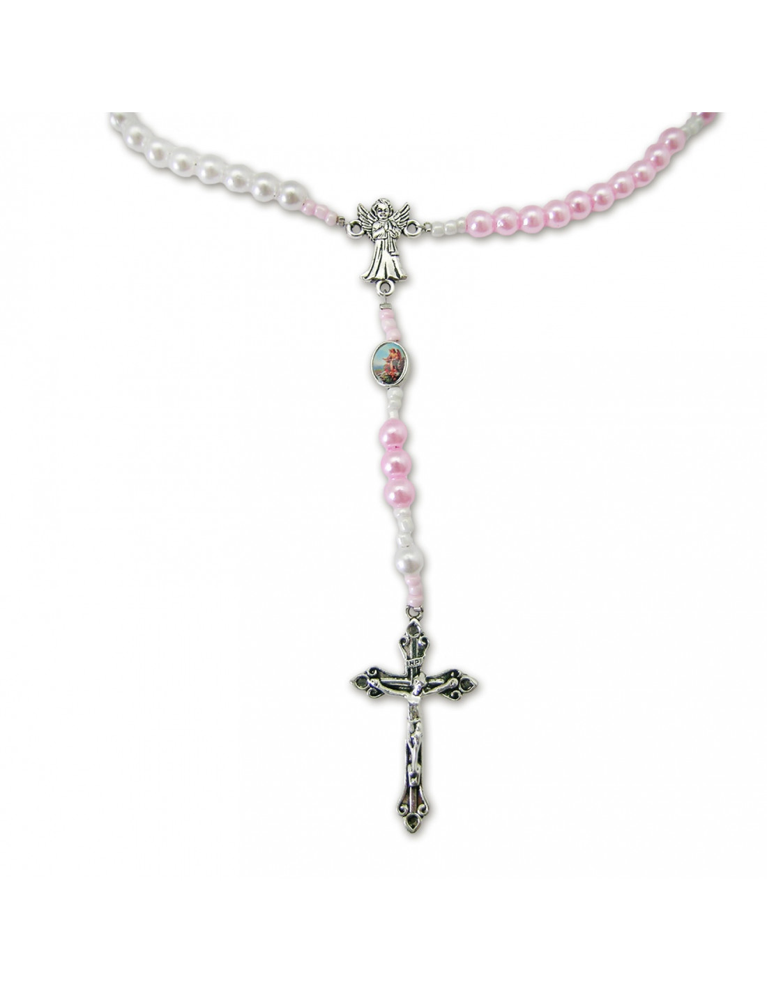 Rosario Collar Plastico Con Maria Angel Guarda Niña Dos Colores Blanco Y Rosa